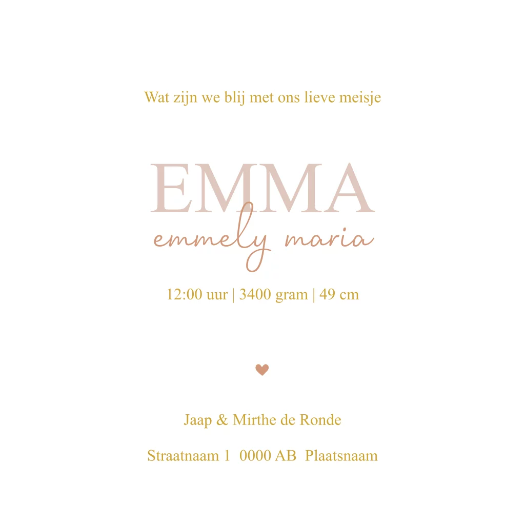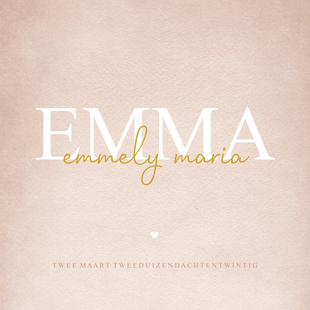 Een mooi stijlvol geboortekaartje voor een meisje. Plaats de roepnaam van je kindje in grote witte letters en zet de doopnamen in het goudkleurige lettertype. (23012)