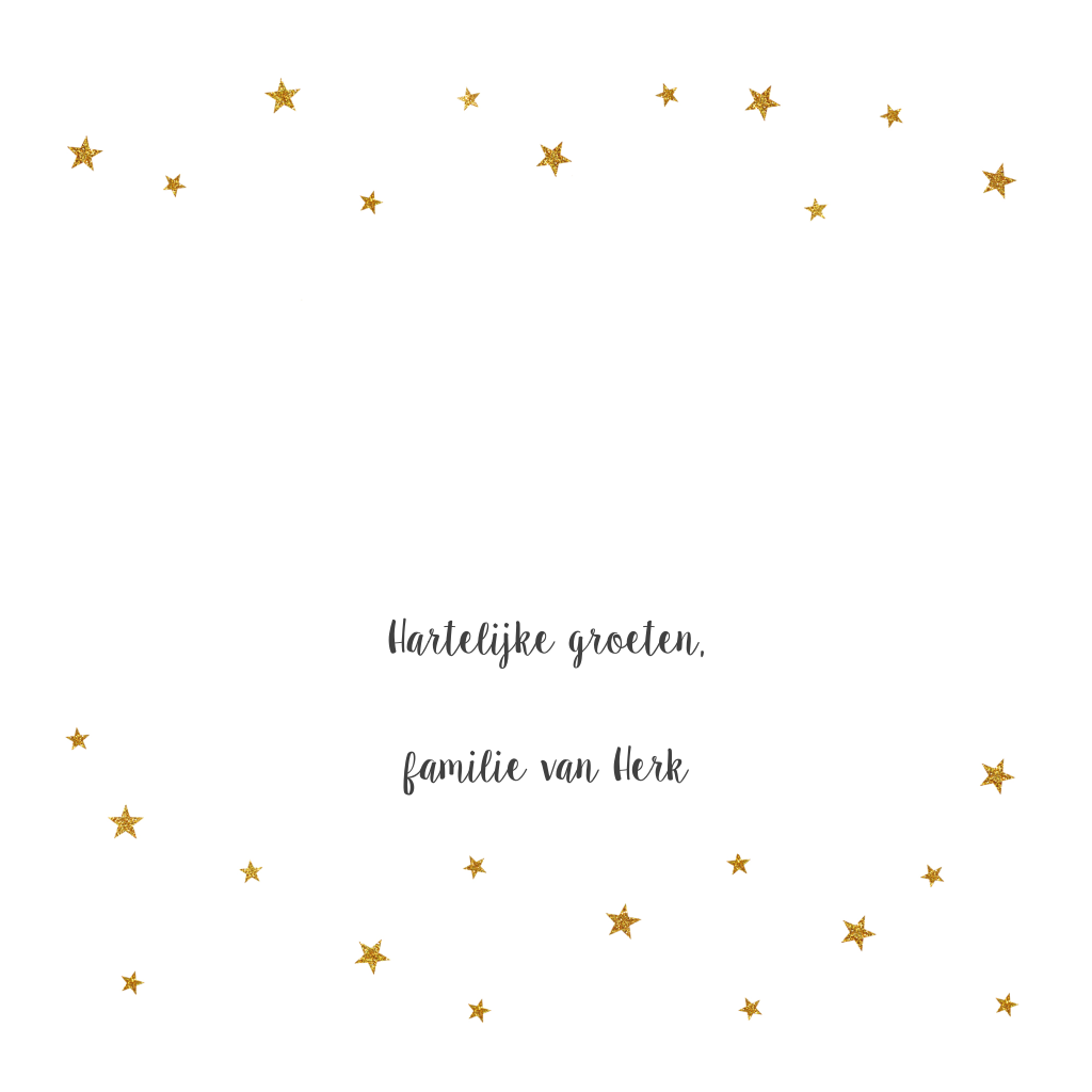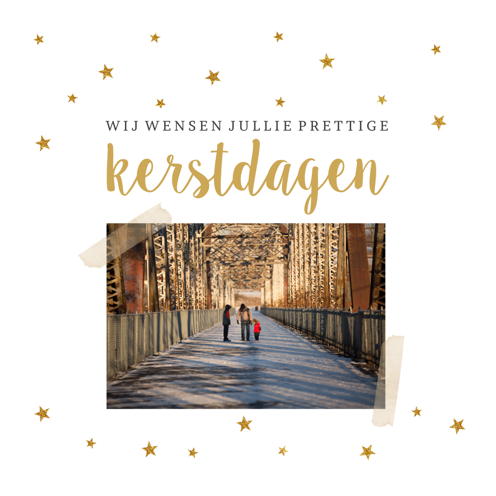Een mooie kerstkaart met witte achtergrond. Goudkleurige sterretjes en kerstwens. Plaats je eigen foto. (6211)