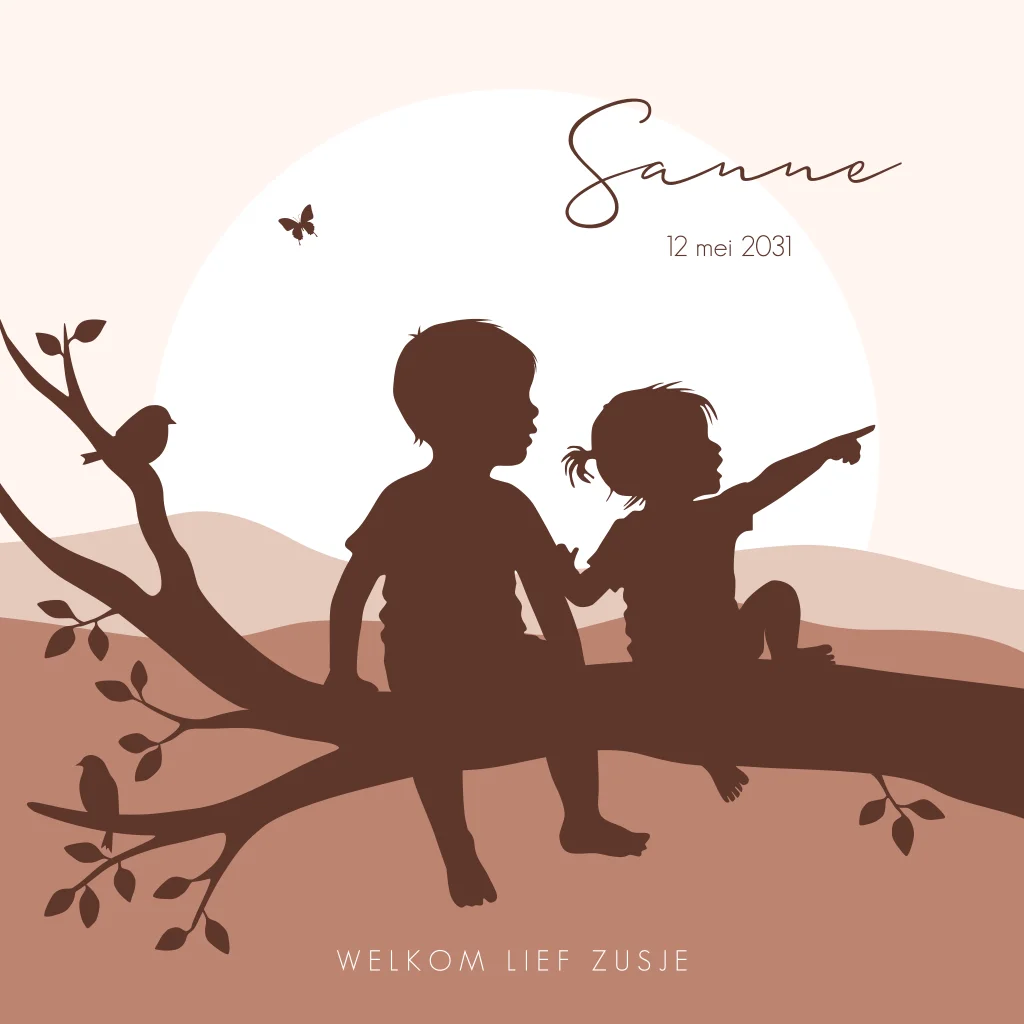 Geboortekaartje voor een tweede kindje met silhouet grote broer en zusje op een tak in een boom met zonsondergang