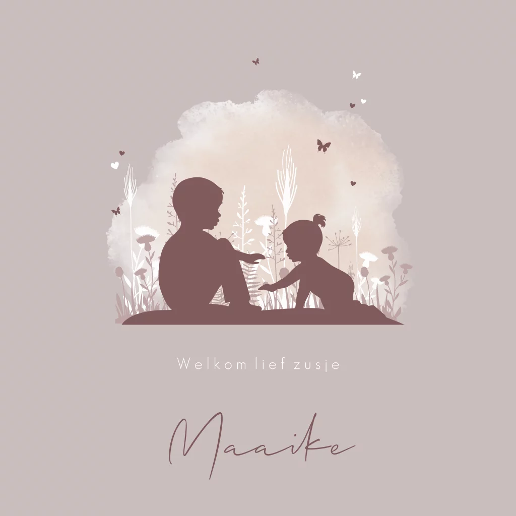 2e kindje Silhouet geboortekaartje voor een meisje met een grote broer in bloemenveld op een watercolor achtergrond. (24312)