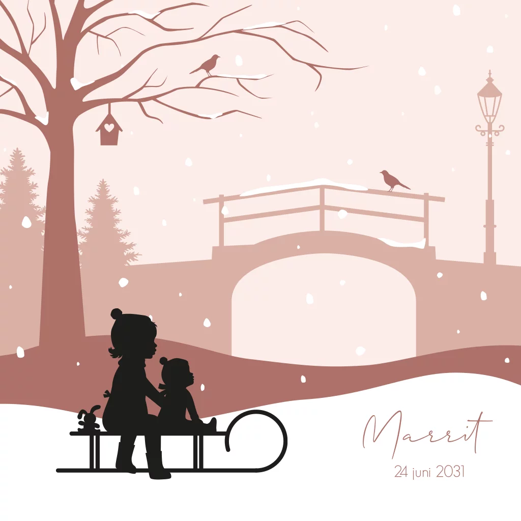 Geboortekaartje 2e kindje winter met silhouet zusjes op slee
