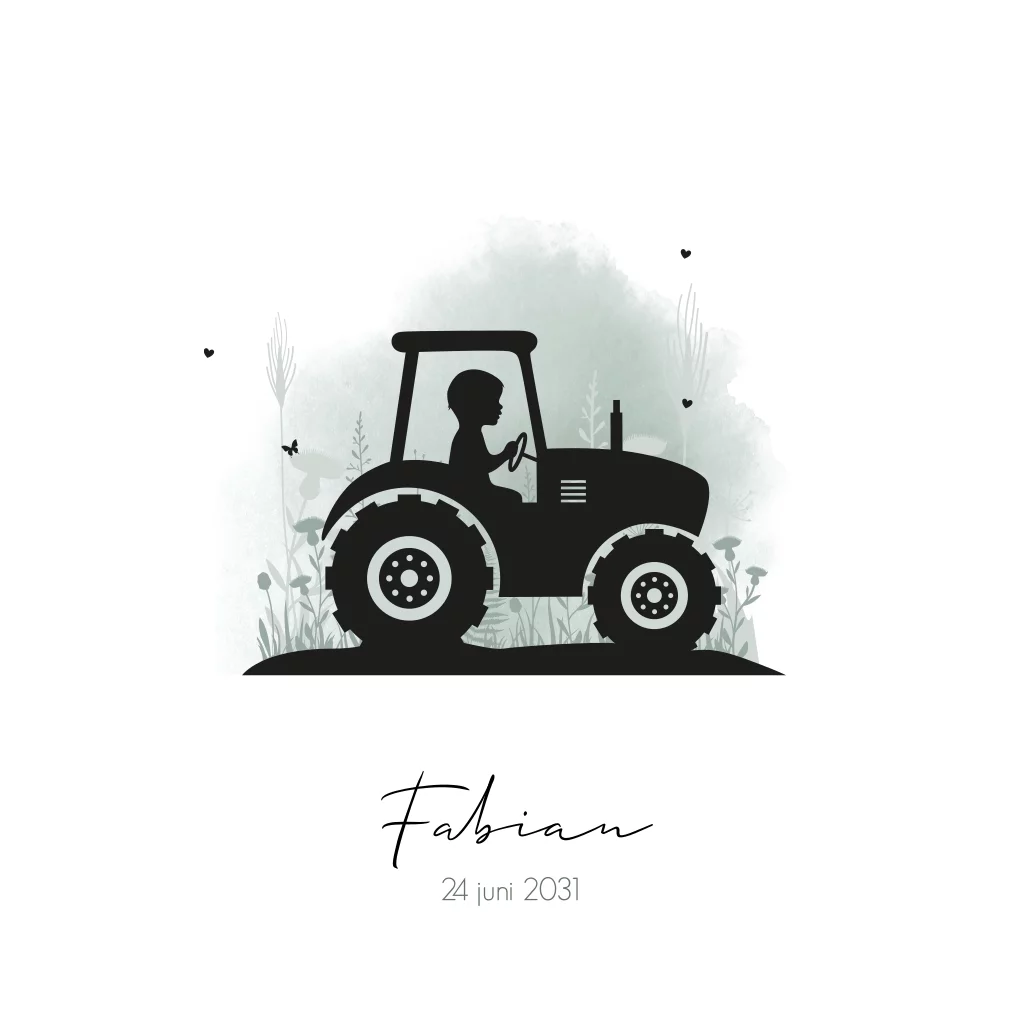 Geboortekaartje jongetje met silhouet tractor in bloemenveld