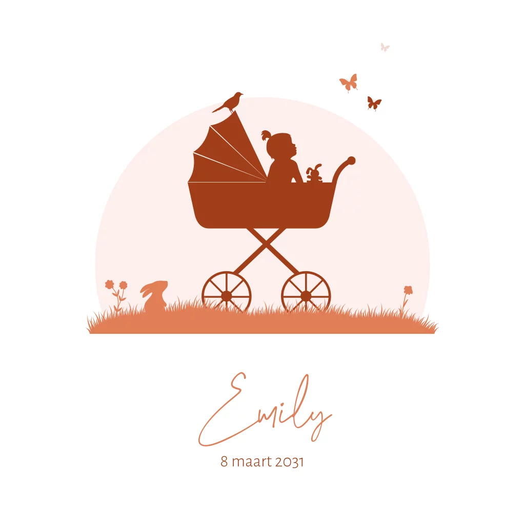Geboortekaartje meisje met silhouet van een baby in kinderwagen