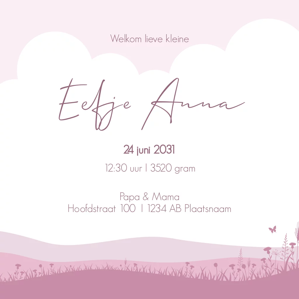 Silhouet geboortekaartje voor een meisje. Met meisje op fiets met bloemen en kat in roze kleuren. (24295)