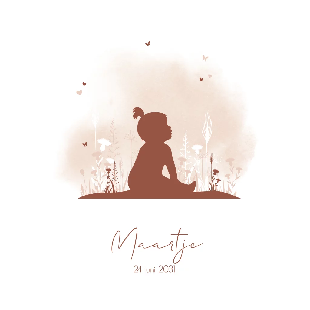 Meisjes geboortekaartje met silhouet van meisje in bloemenveld