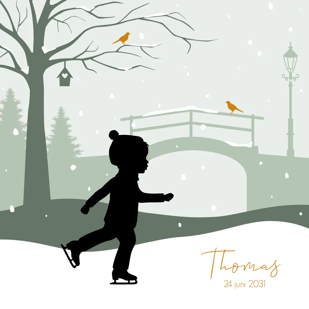 Geboortekaartje winter met silhouet schaatsend jongetje