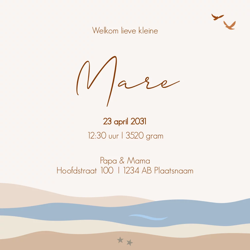 Meisjes geboortekaartje strand met silhouet meisje met emmer, zandkasteel, zee en vuurtoren. (24580)