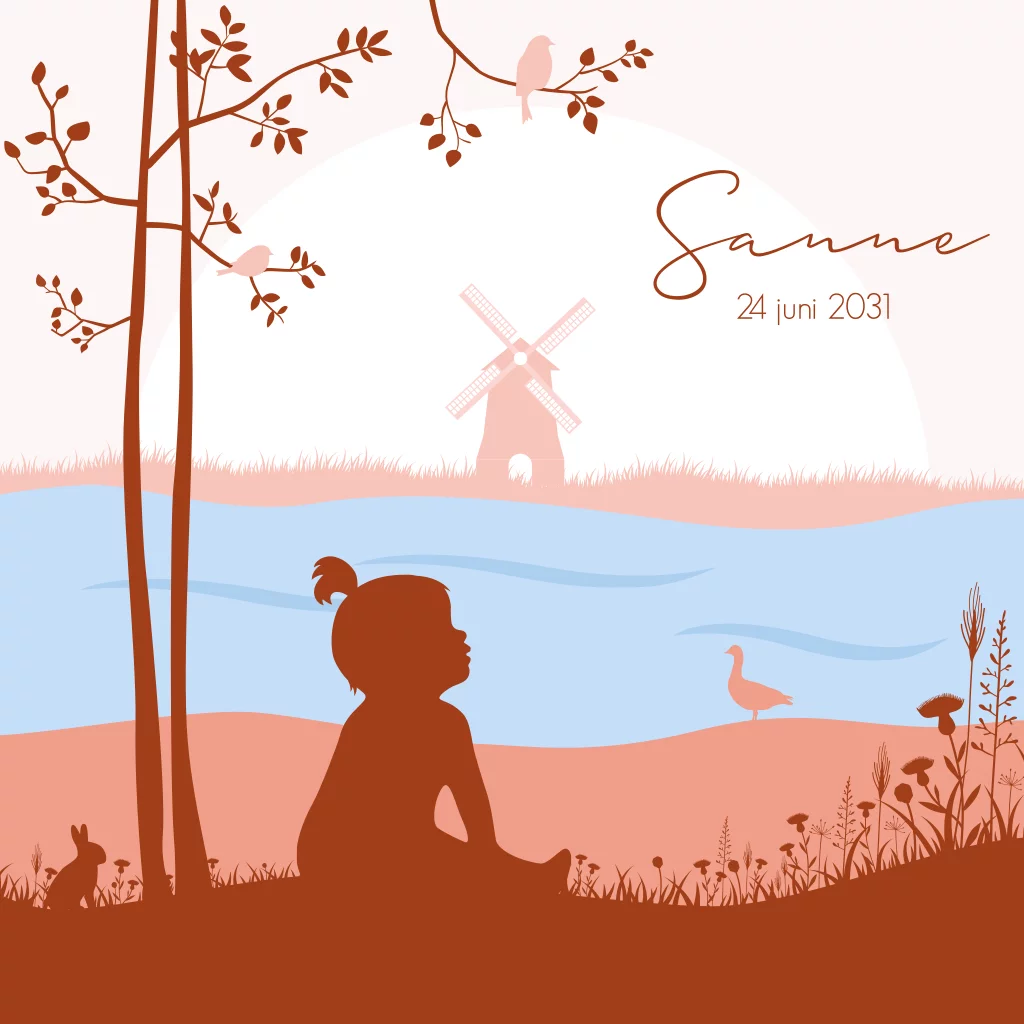 Lief silhouet geboortekaartje met baby meisje in landschap met molen en dieren. (24530)