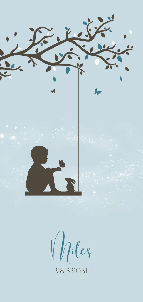 Silhouet geboortekaartje met jongetje en konijntje op een schommel. (23885)