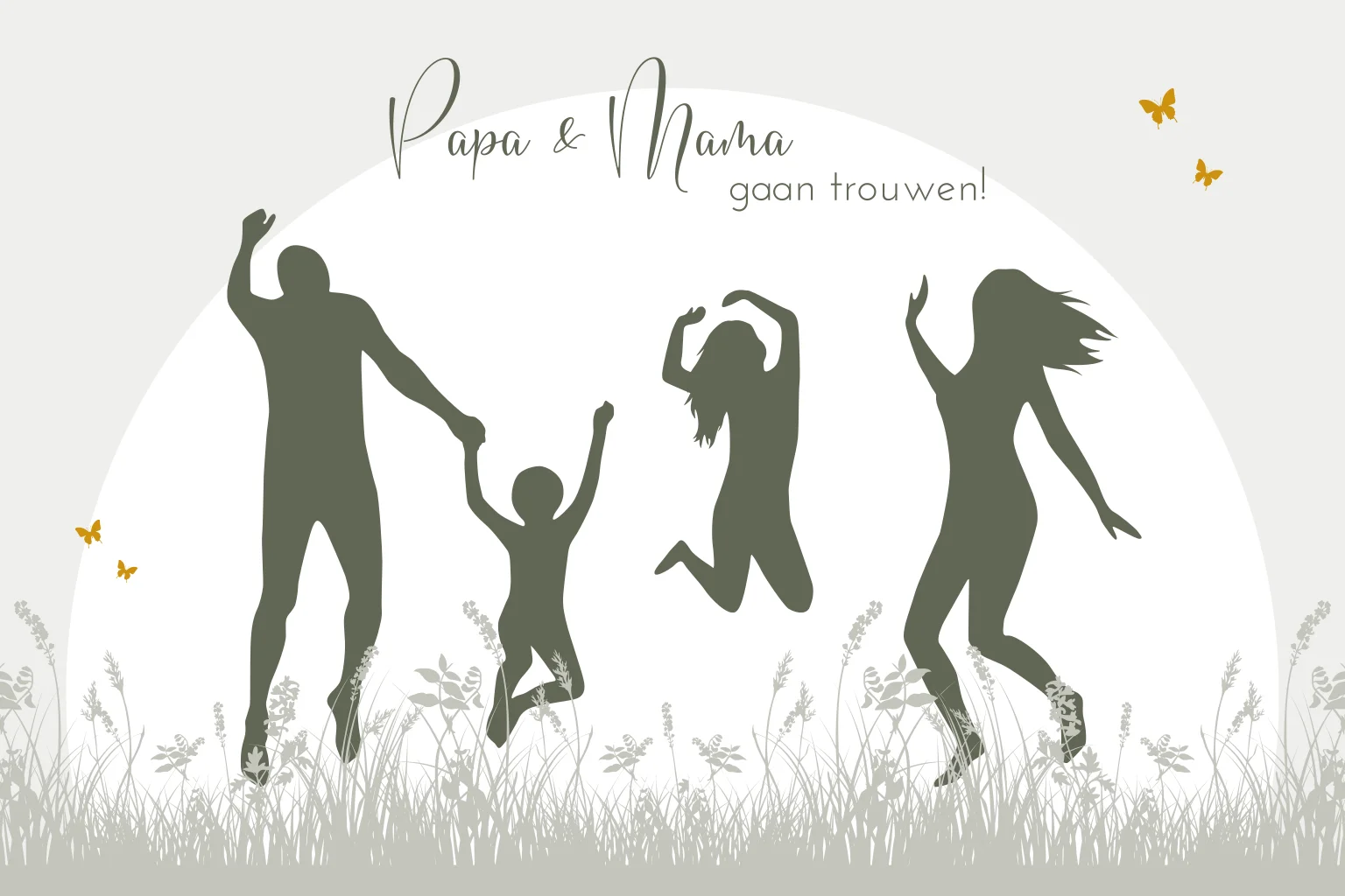 Leuke trouwkaart met silhouetten van een springend / dansend gezin. Papa en mama gaan trouwen. Aantal kinderen kan eenvoudig worden aangepast. (23892) Willen jullie de tekening aangepast hebben zodat het meer op jullie lijkt? Vaak is dat mogelijk, neem daarvoor contact met ons op.