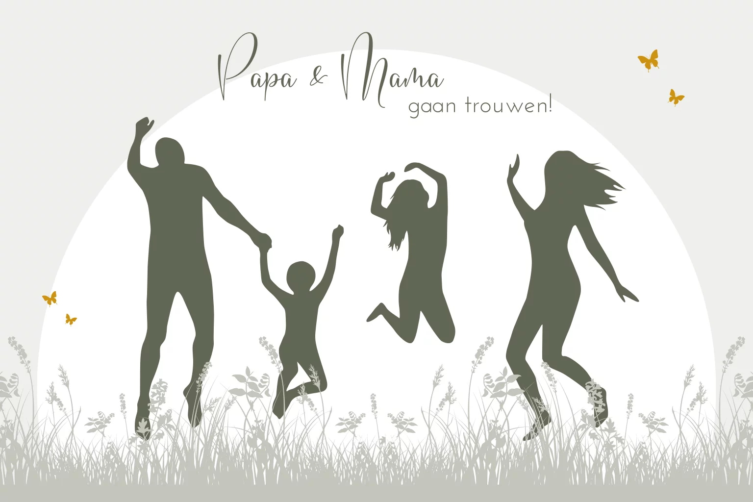 Leuke trouwkaart met silhouetten van een springend / dansend gezin. Papa en mama gaan trouwen. Aantal kinderen kan eenvoudig worden aangepast. (23892)