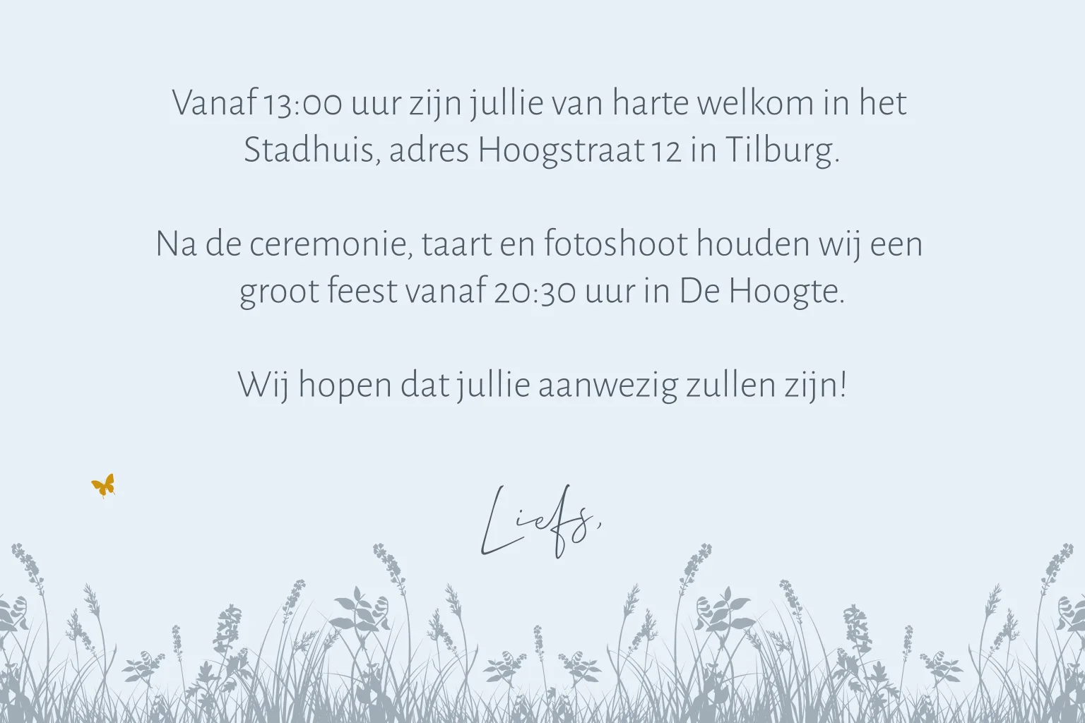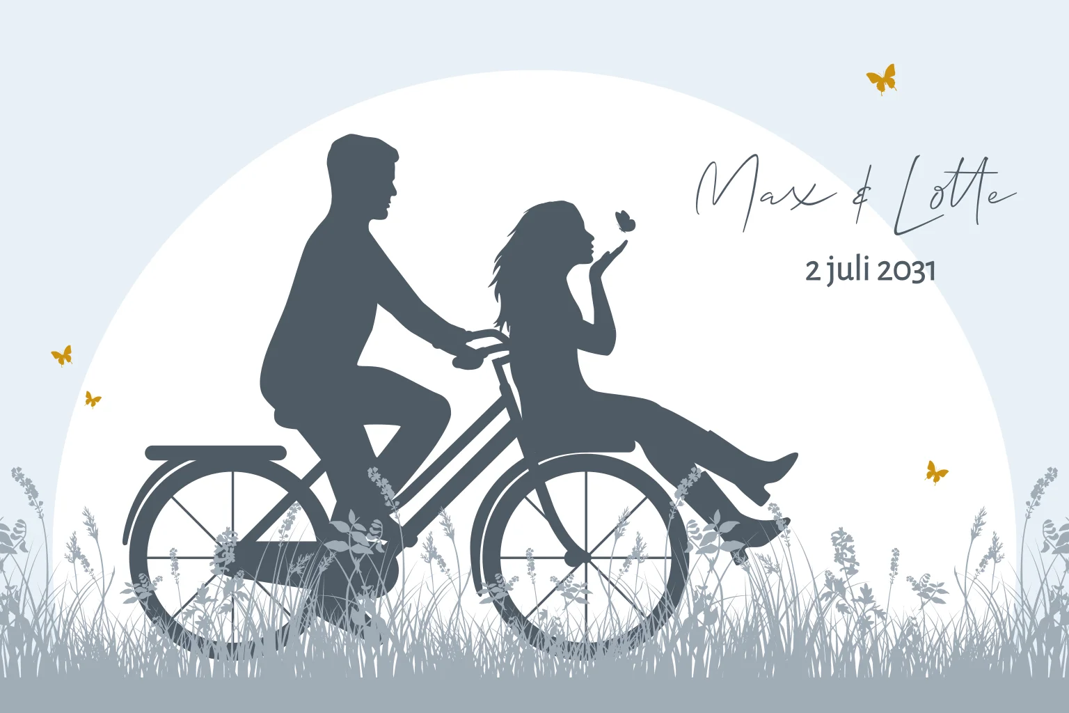 Leuke silhouet trouwkaart met een stel op een fiets. (23891) Willen jullie de tekening aangepast hebben zodat het meer op jullie lijkt? Vaak is dat mogelijk, neem daarvoor contact met ons op.