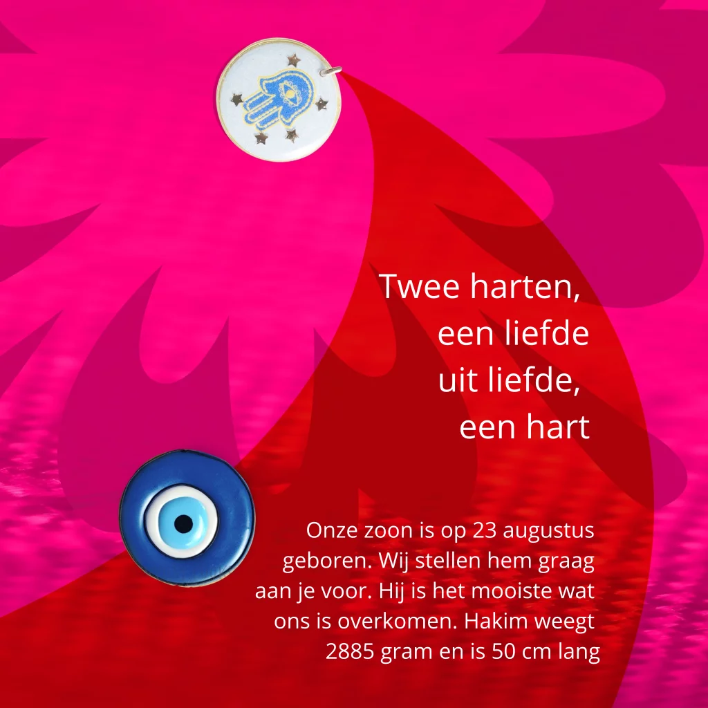Arabisch geboortekaartje meisje roze met handje Fatima. Nederlandse klompjes en blauw arabisch oogje. (625)