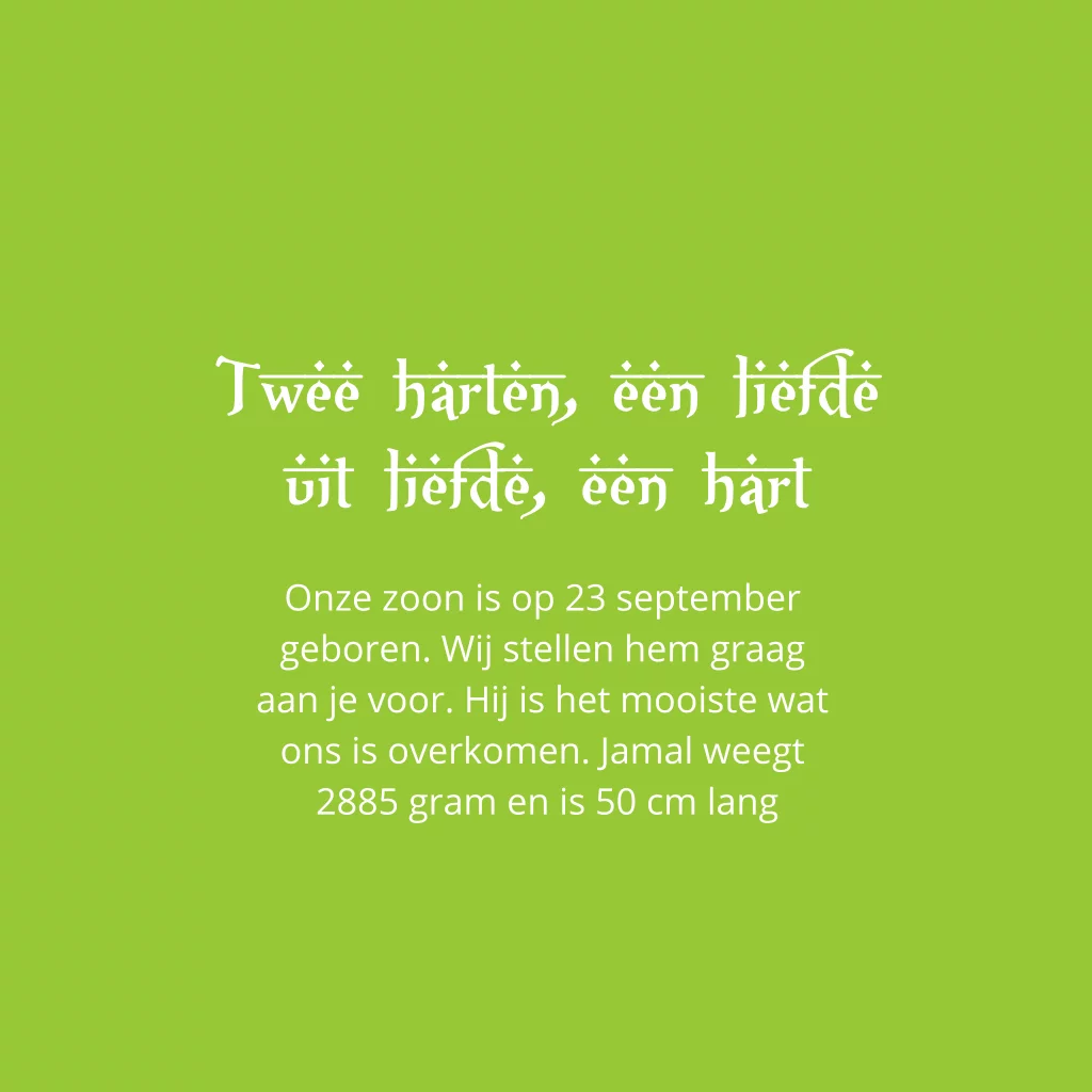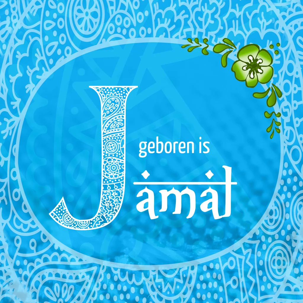 Arabische geboortekaart jongen blauw met henna letter. Kleur aan de binnenzijde aan te passen. Gewenste letter invoegen via afbeelding en versieringen, clipart letters. (684)