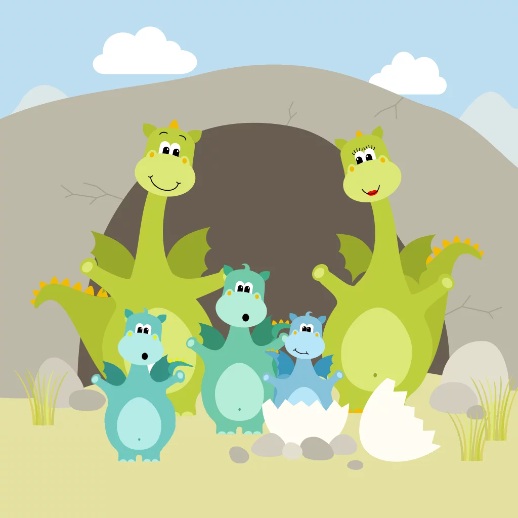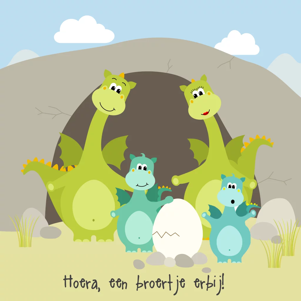 Leuk getekend geboortekaartje voor de geboorte van een 3e kindje jongen met 2 grote broers. Draakjes / dinosaurus familie met blauwe babydraak in grot. Leuke details en mee-ontworpen achterkant!