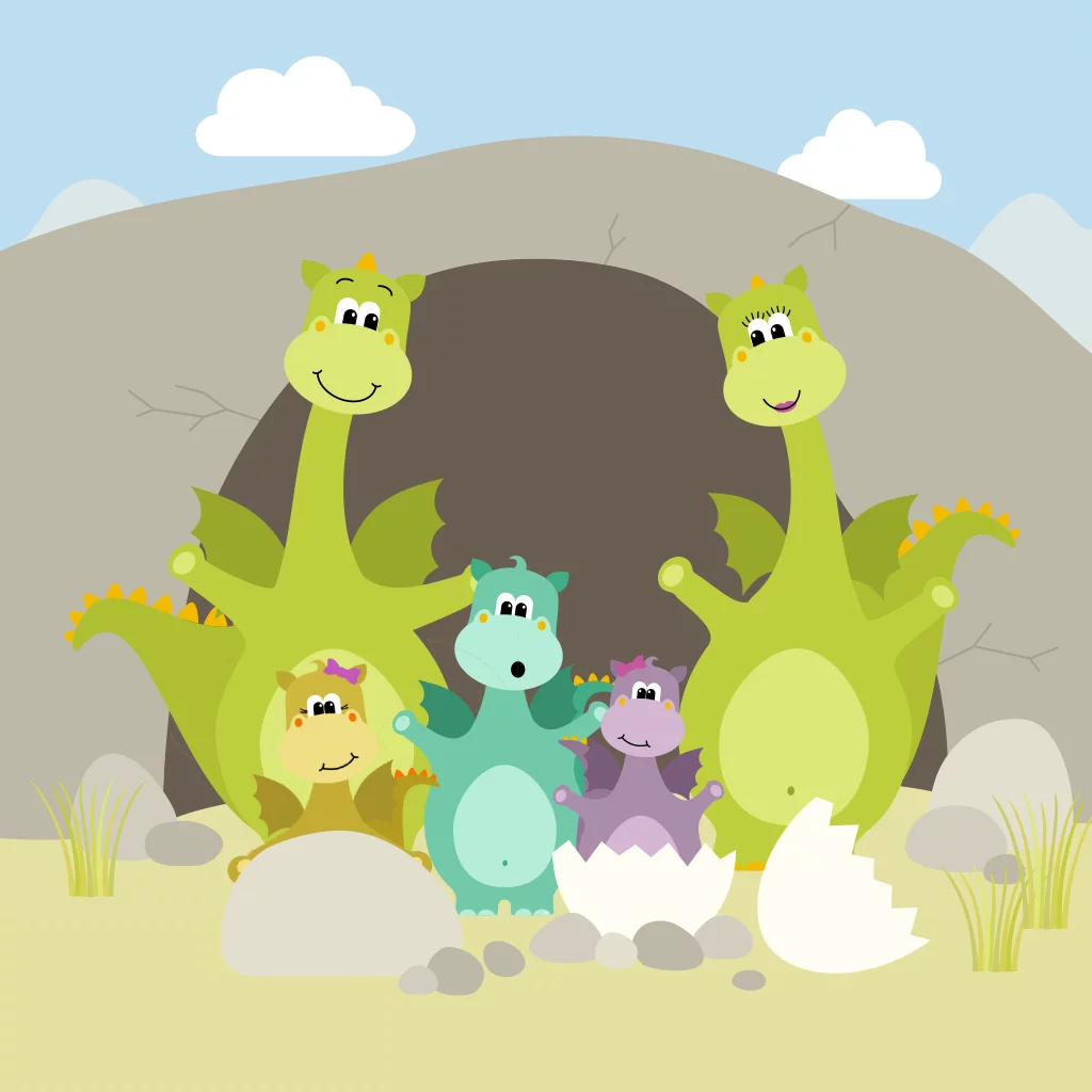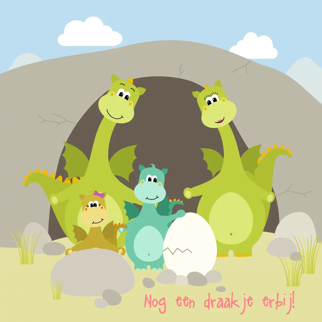 Origineel geboortekaartje voor geboorte meisje met grote broer en zus. Draakjes familie met paarse babydraak in grot. Leuke details en mee-ontworpen achterkant!