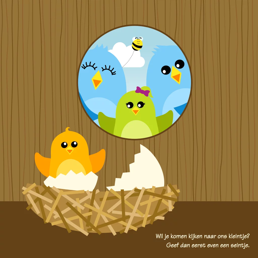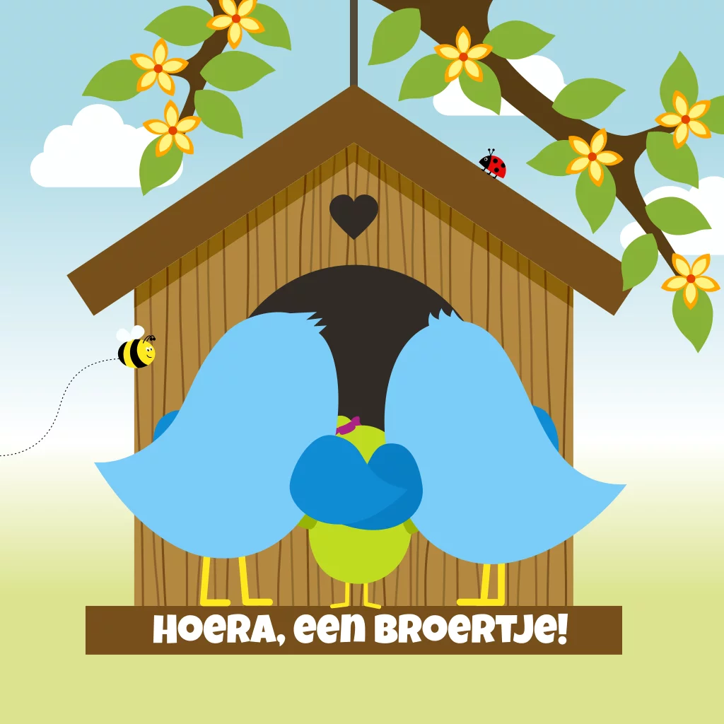 Grappig geboortekaartje jongen en zus in vogelhuisje