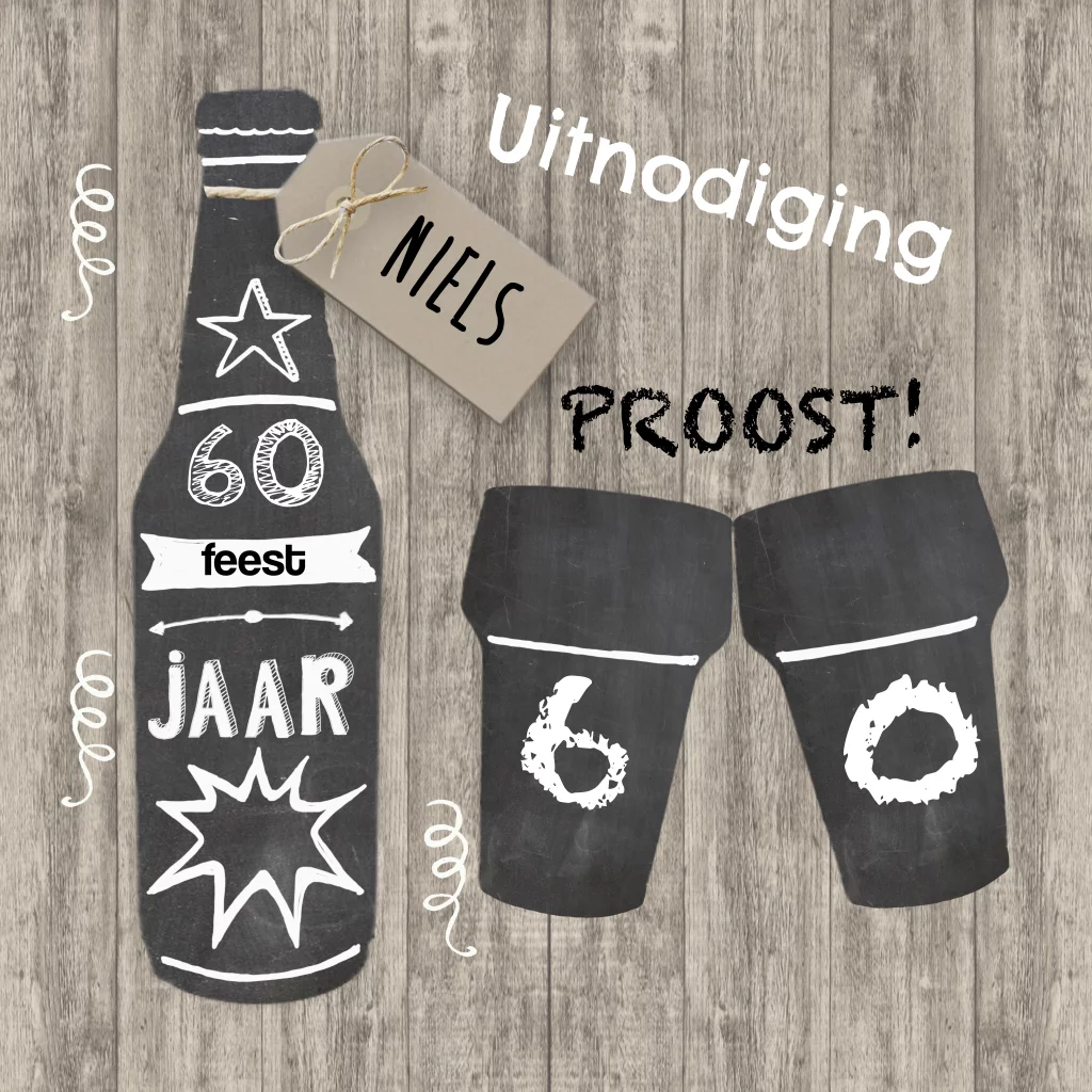Uitnodiging zestigste verjaardag voor een man met bier en bierglazen als krijtbord en houtprint. (3730)
