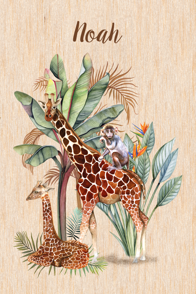 Jungle geboortekaartje op echt hout met giraf en aap. Voor een jongen en meisje. (23073)