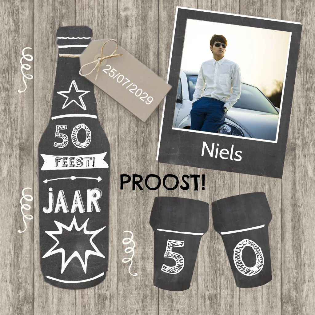 Uitnodiging 50e verjaardag voor een man met flesje bier als krijtbord en bierglazen met handlettering teksten op hout. (3731)