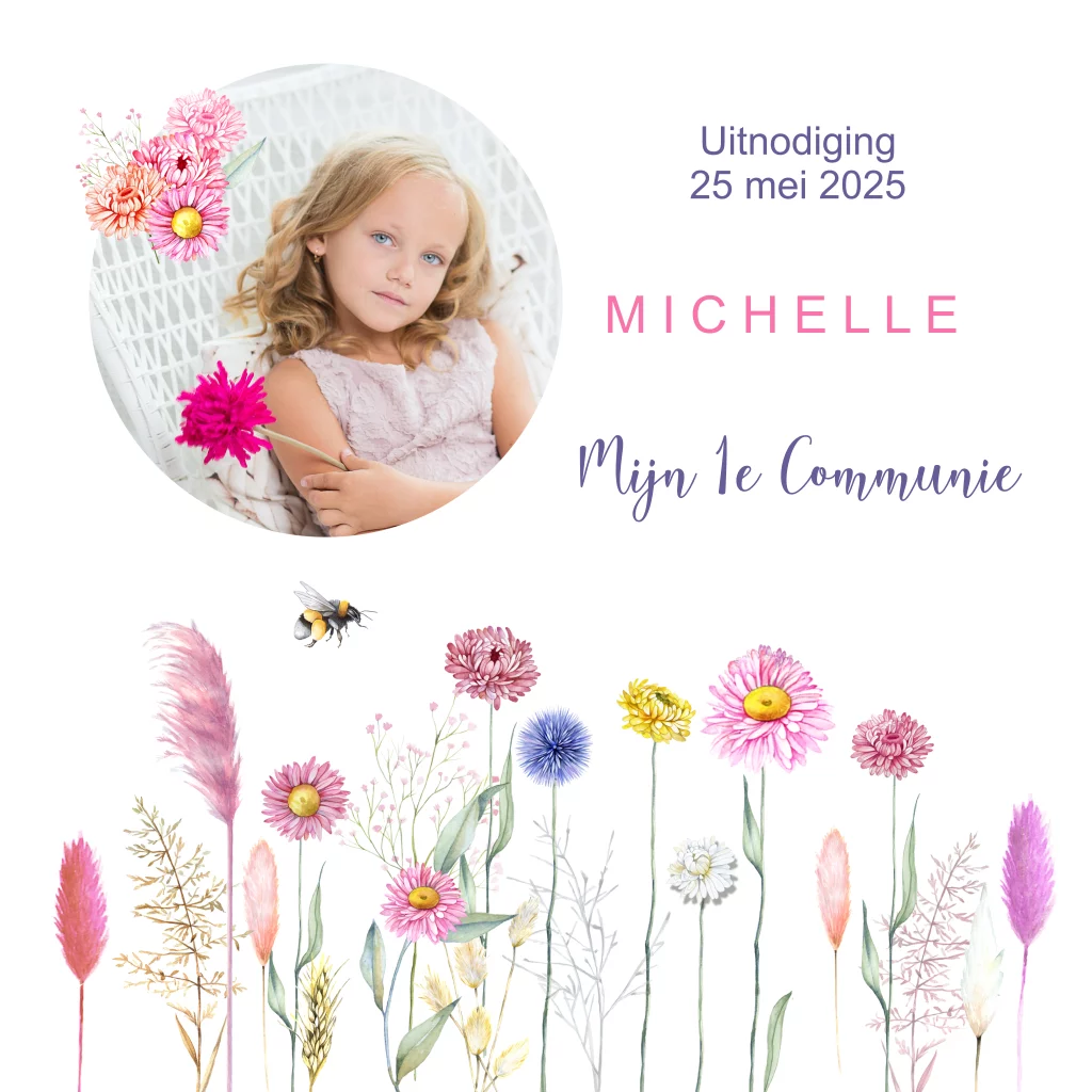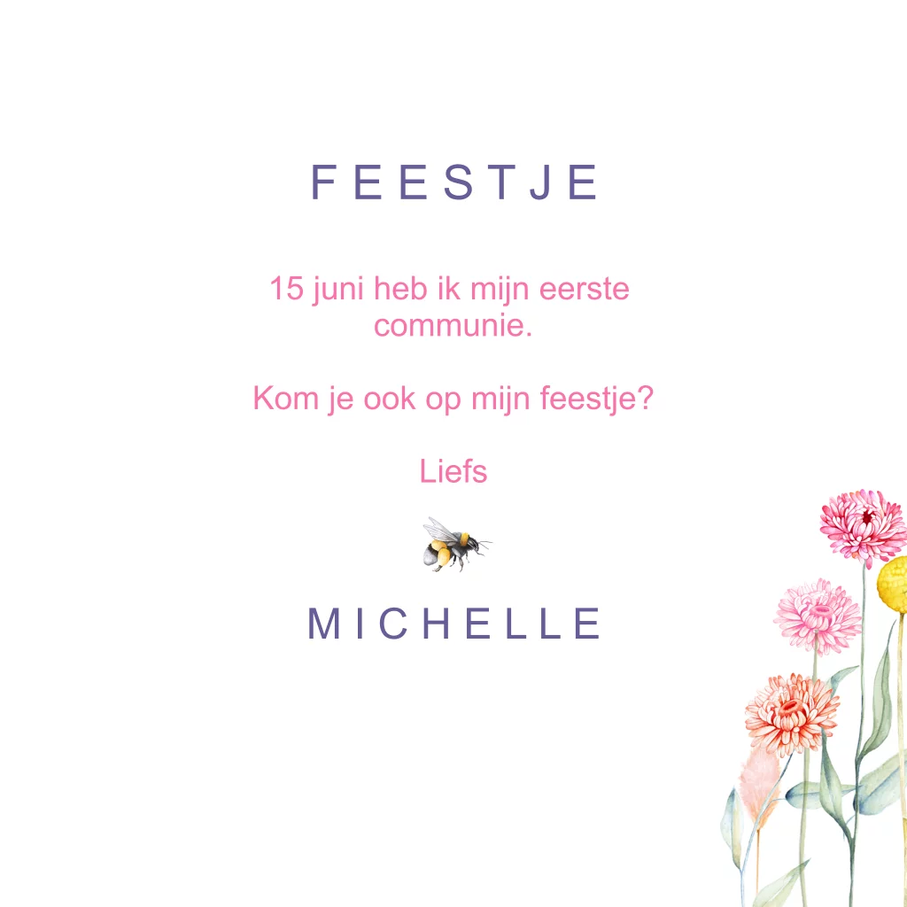 Communie uitnodiging meisje bloemetjes bijtje