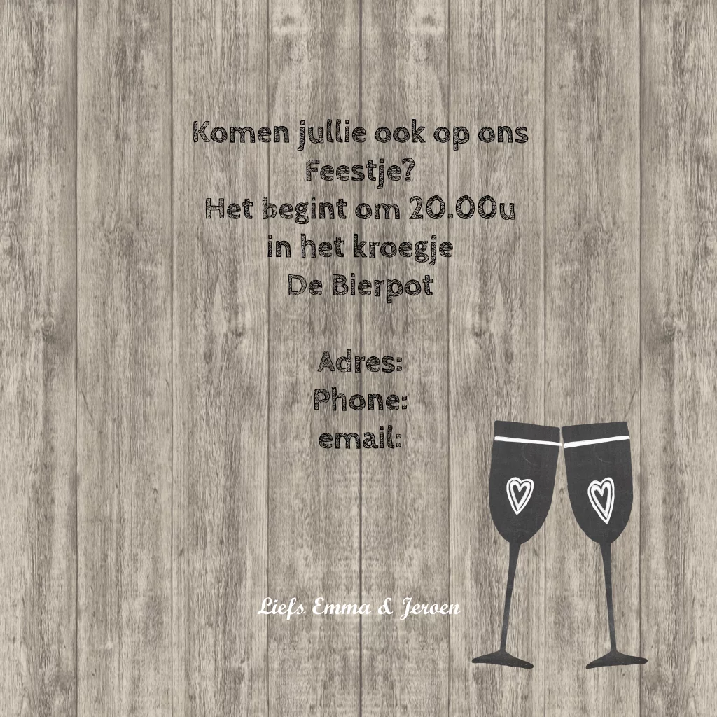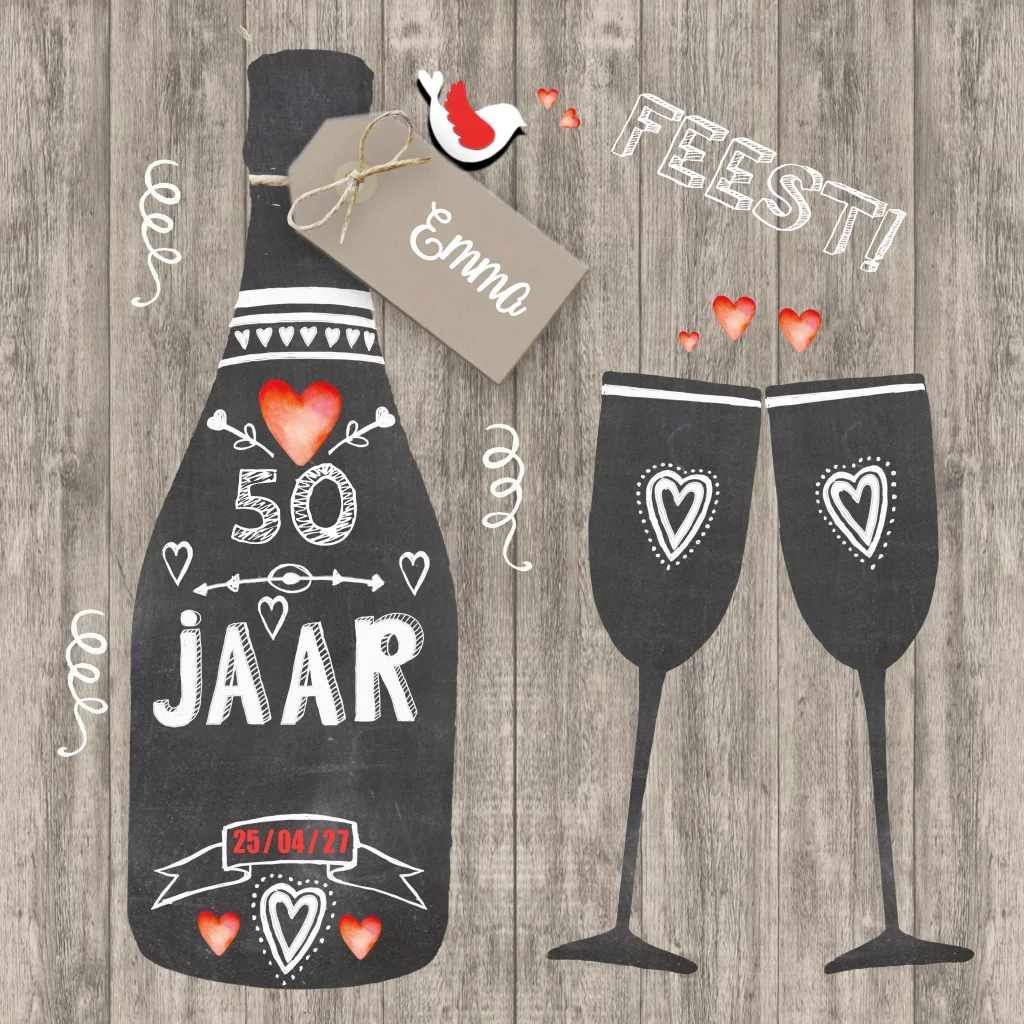 Uitnodiging verjaardag 50 jaar met fles wijn en glazen van schoolbord op hout en leuk label met vogeltjes (3624).