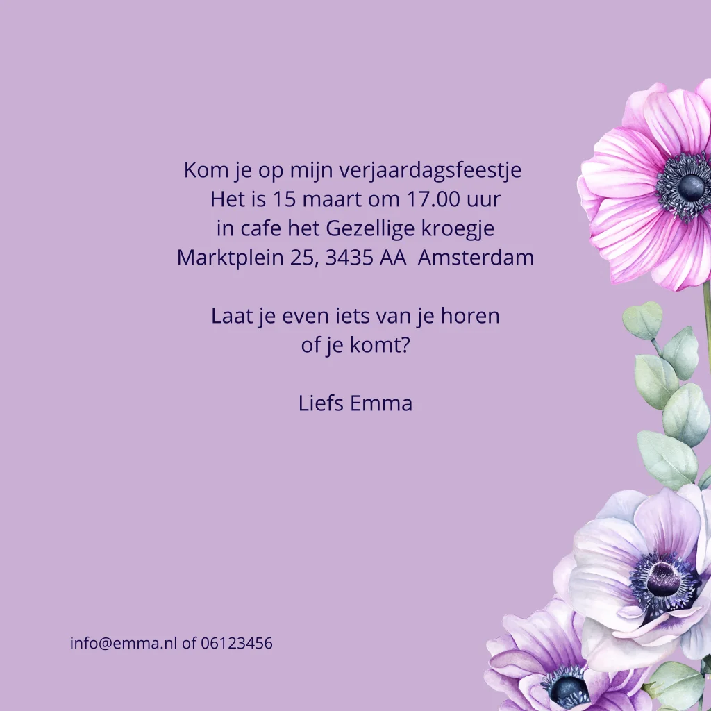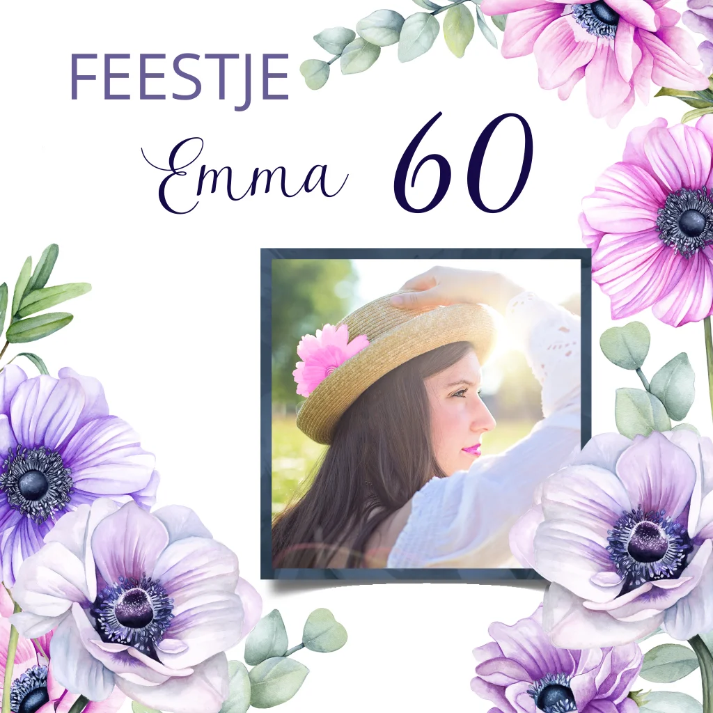Feestelijke uitnodiging verjaardag 60 jaar met paarse anemonen