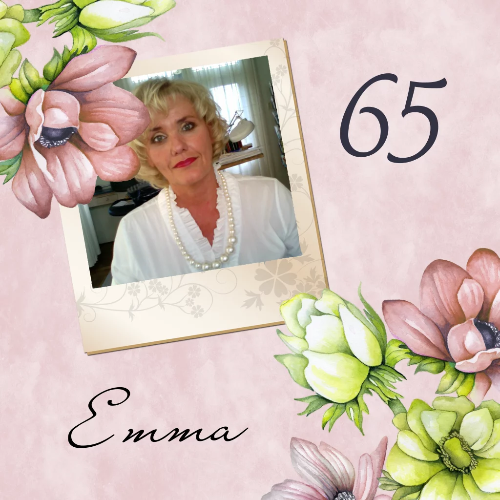 Uitnodiging voor een feestje 65 jaar verjaardag met mooie anemonen op poederroze achtergrond en leuke foto van de jarige. (4871)