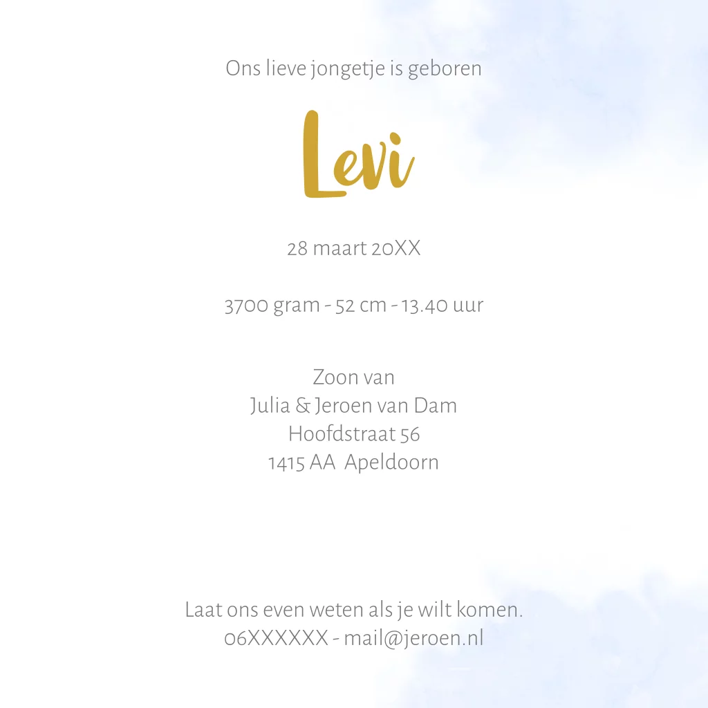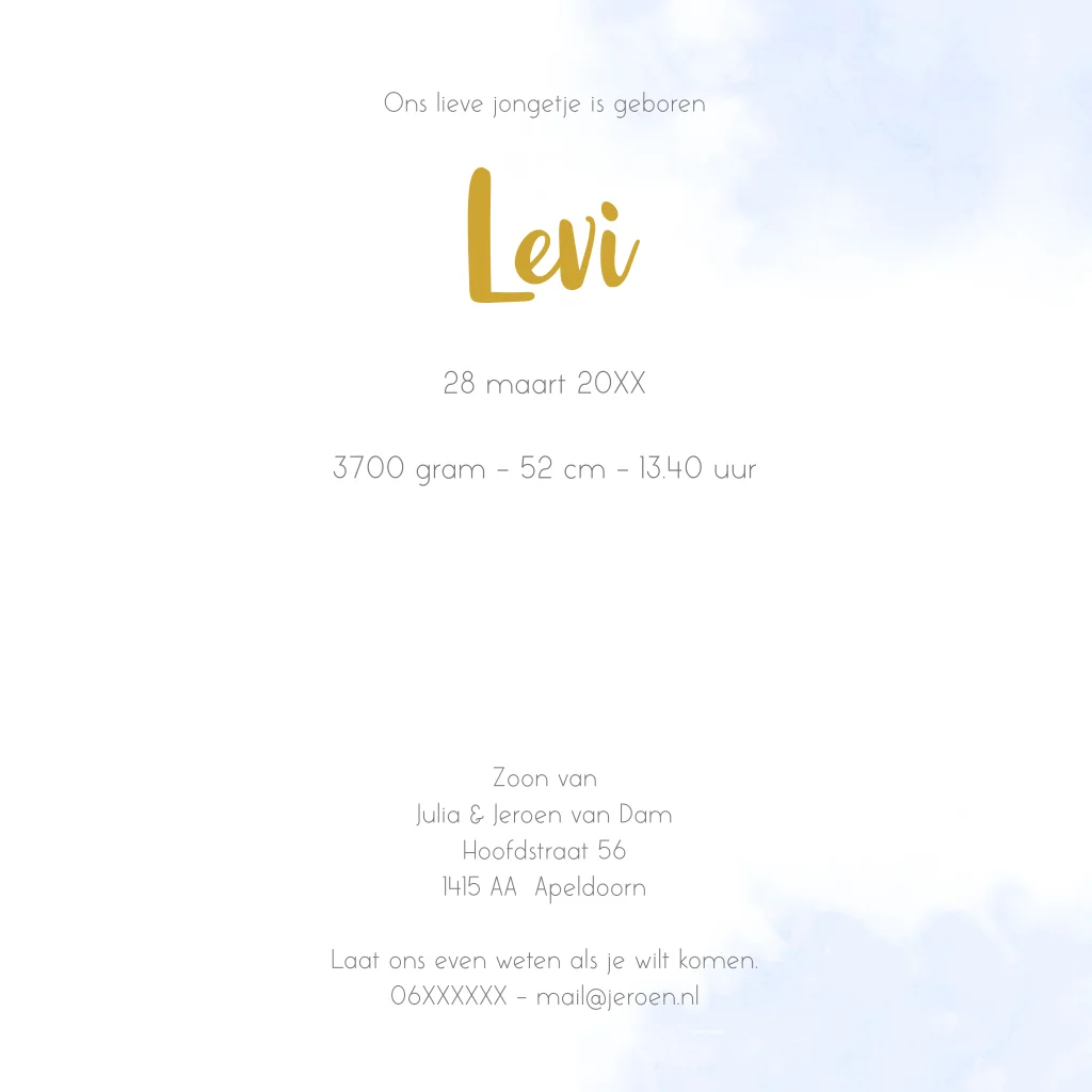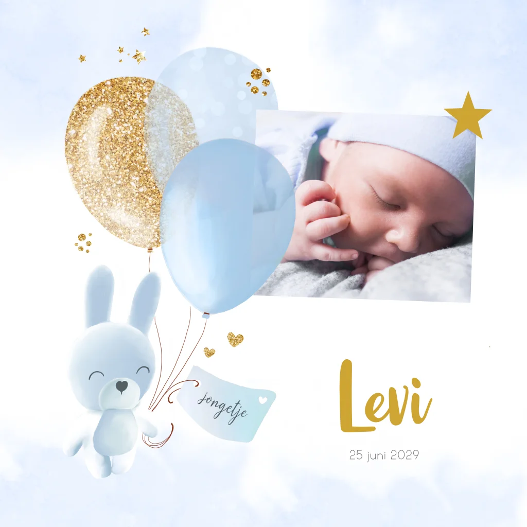 Foto geboortekaartje voor een jongen met konijntje, ballonnen en ruimte voor een eigen foto. (23852) Geboortekaar Levi.