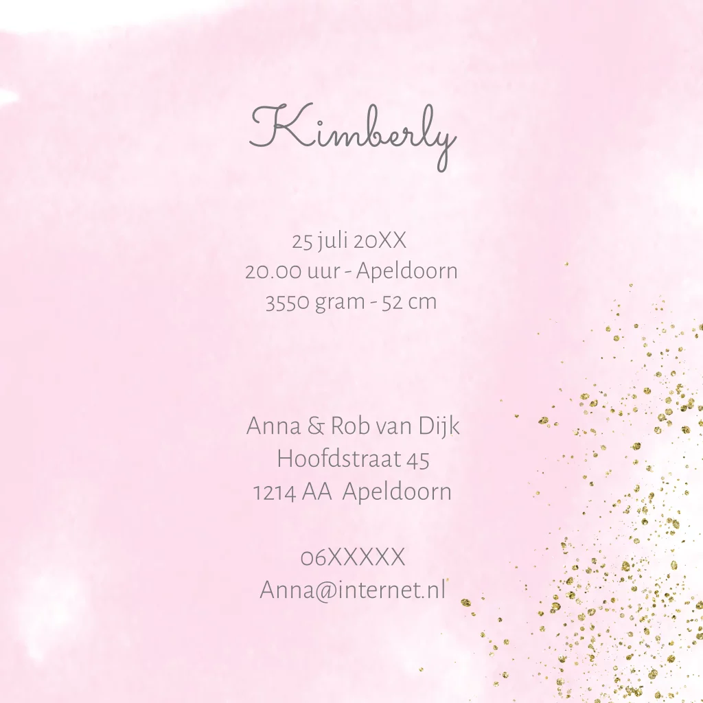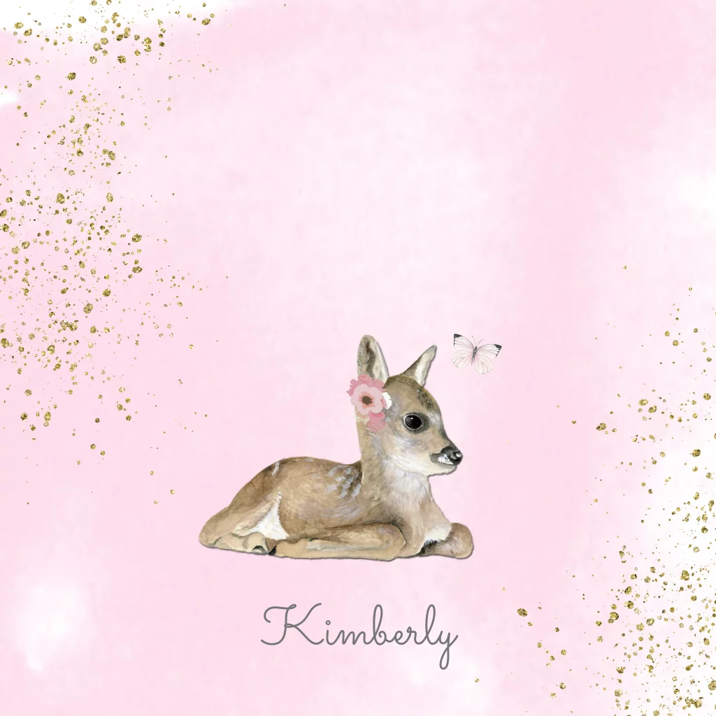 Geboortekaartje meisje met getekend lief klein hertje in aquarel op roze achtergrond versierd met goudkleurige glitters. (6154)