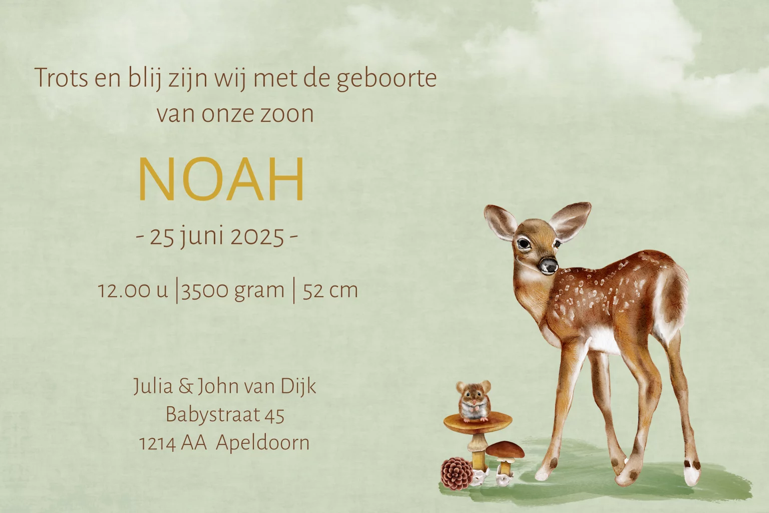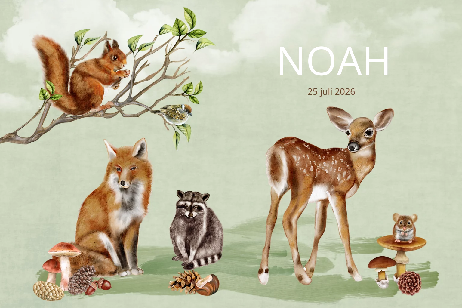 Geboortekaartje bosdieren getekende met groen