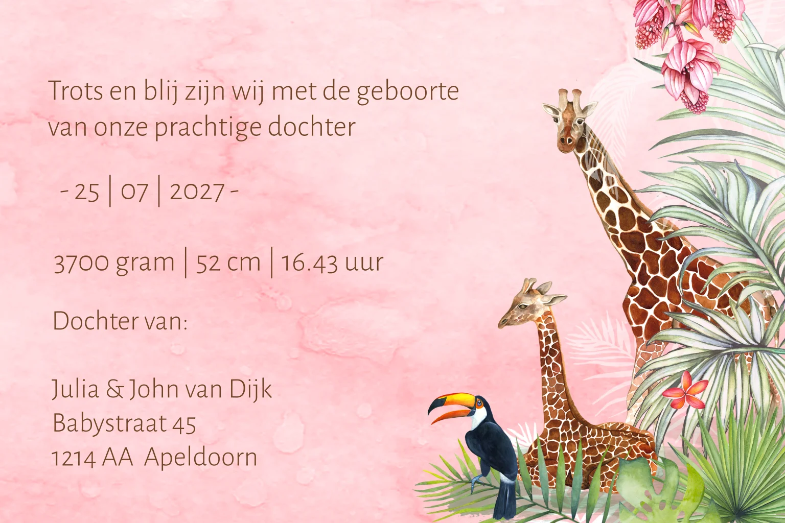 Geboortekaartje voor een meisje in jungle thema met verschillende jungle dieren en de naam in glimmende goudfolie (30132)