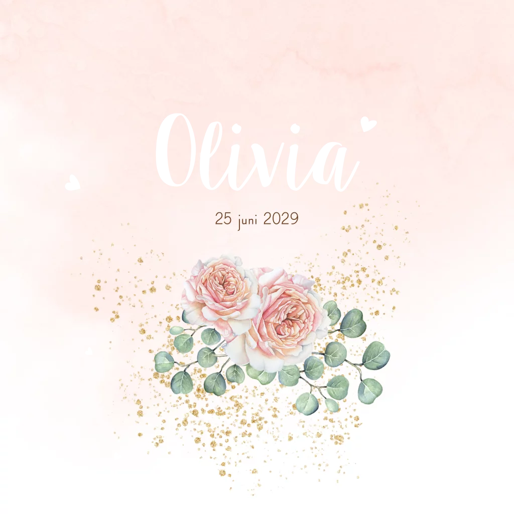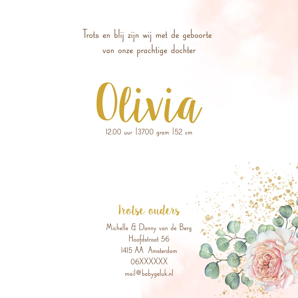 Geboortekaartje voor een meisje met een roos als geboortebloem voor de maand juni (23853) Geboortekaartje Olivia