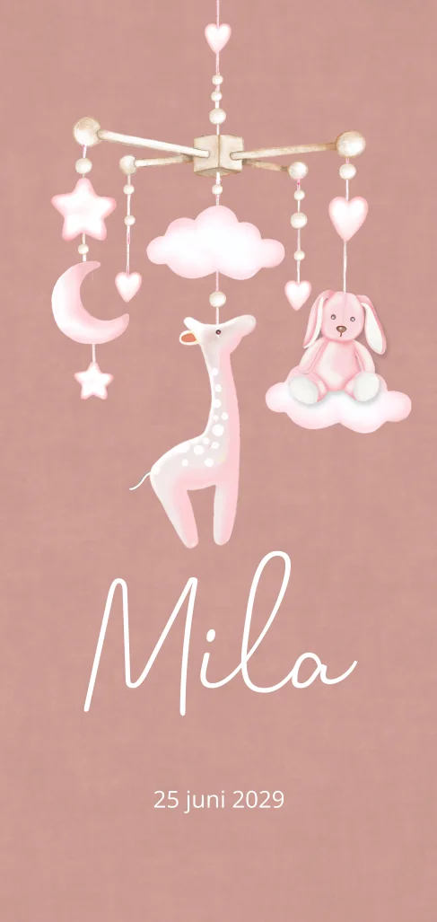 Geboortekaartje voor een meisje met mobiel babyknuffels