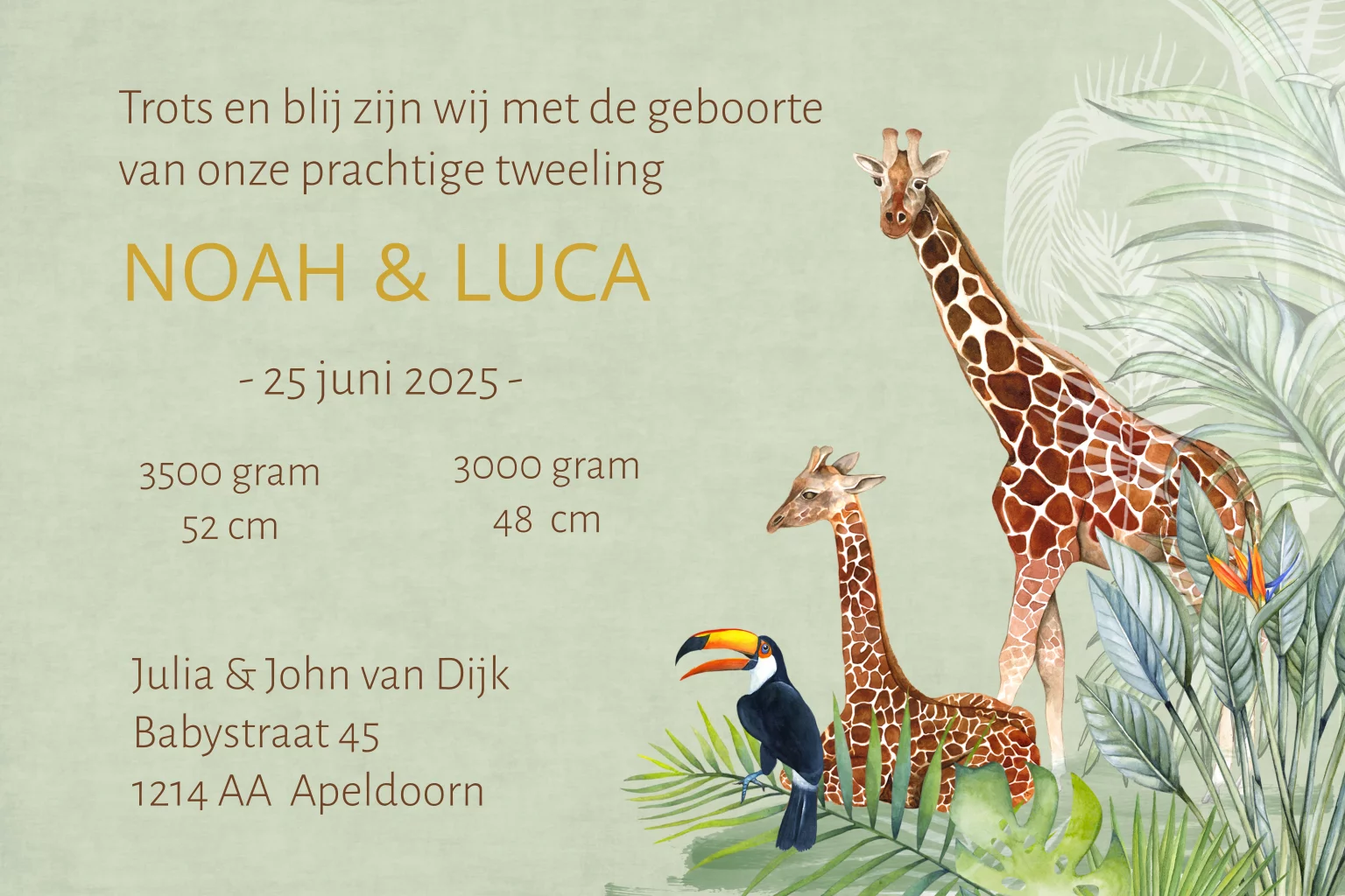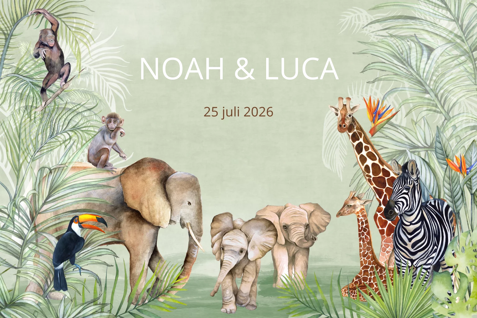 Geboortekaartje voor een tweeling in jungle thema met olifantjes