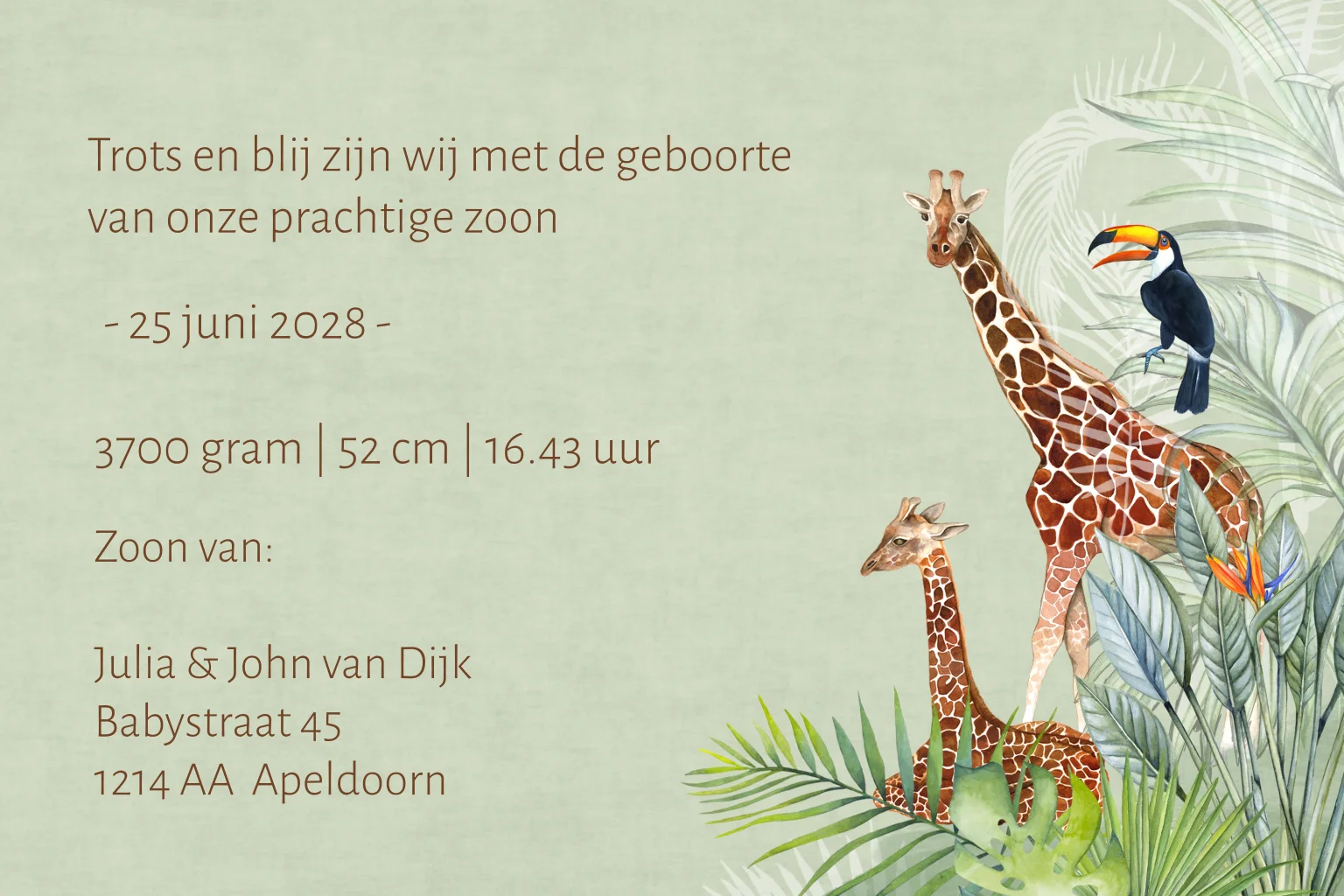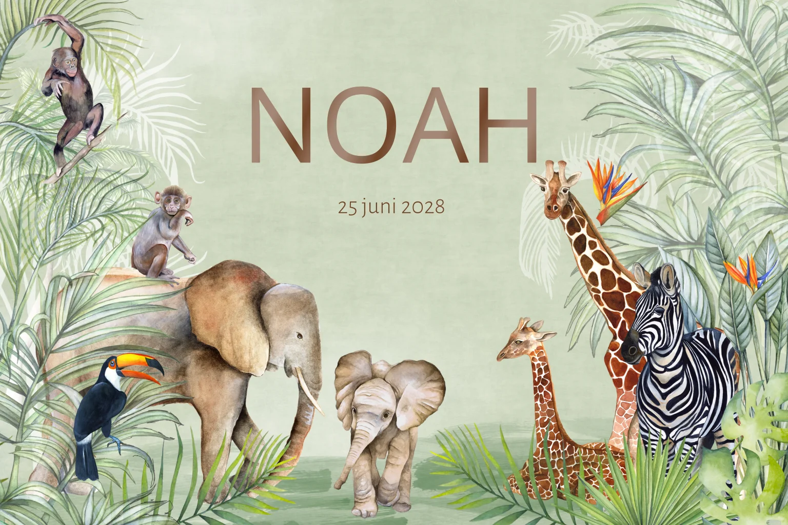 Geboortekaartje neutraal jungle dieren met olifantje giraf zebra