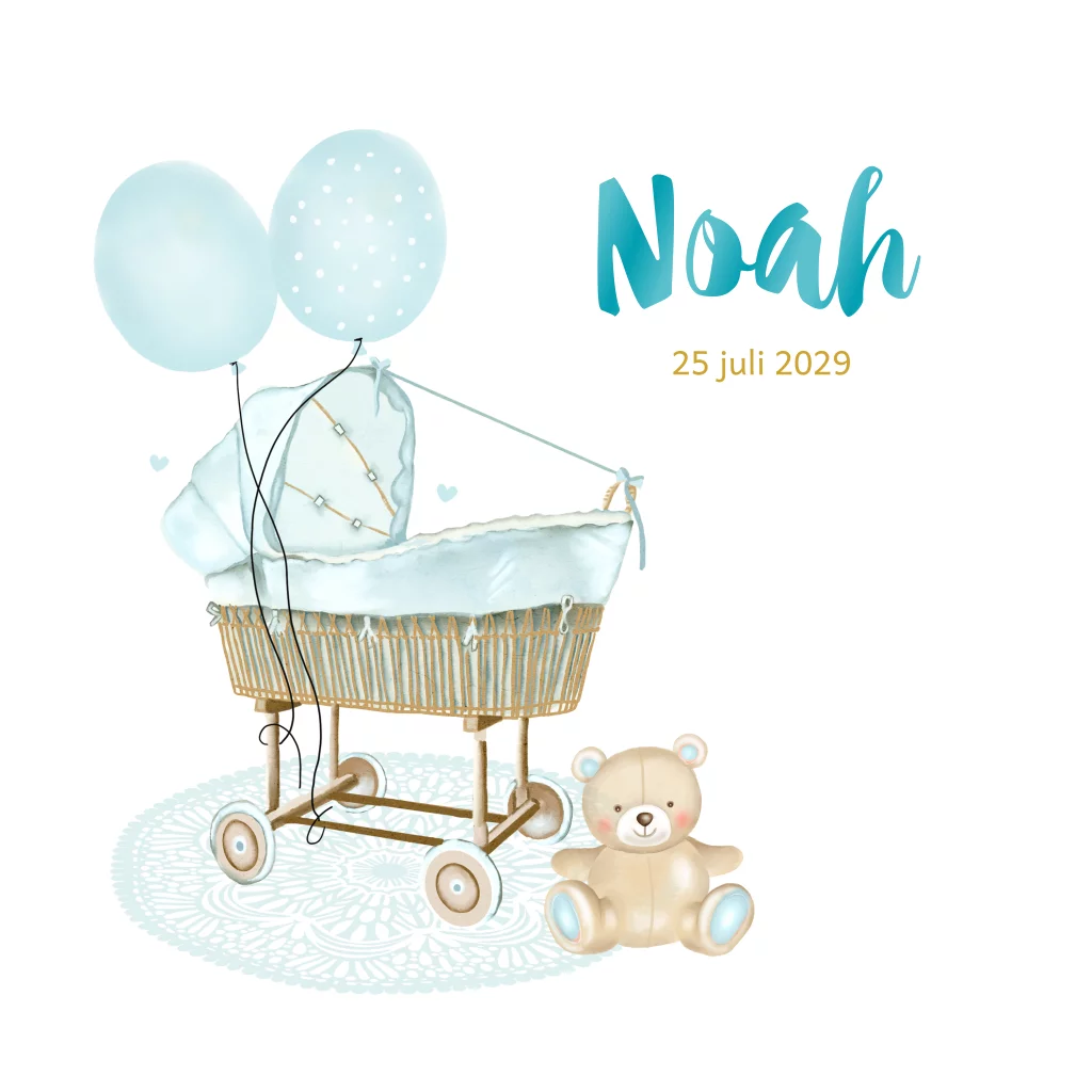 Geboortekaartje voor een jongen met wiegje versierd met ballonnen en lief beertje. (23738)