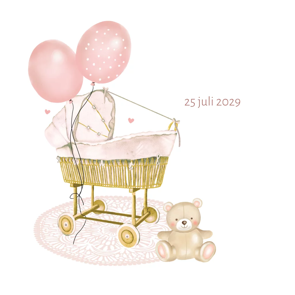Lief geboortekaartje voor een meisje met wiegje beertje ballonnen