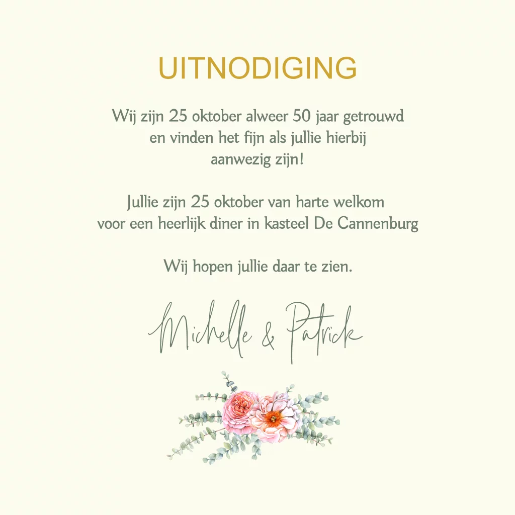 Uitnodiging 50 jaar getrouwd / gouden huwelijk met mooie rozen en eucalyptus en echte folie voor een gouden huwelijk. (23431)