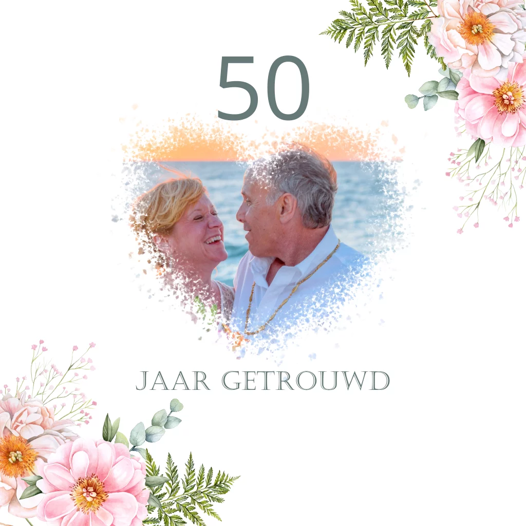 Foto uitnodiging 50 jaar getrouwd voor huwelijksjubileum met mooie botanische rozen en mooi kader van hart voor je foto. (23527)