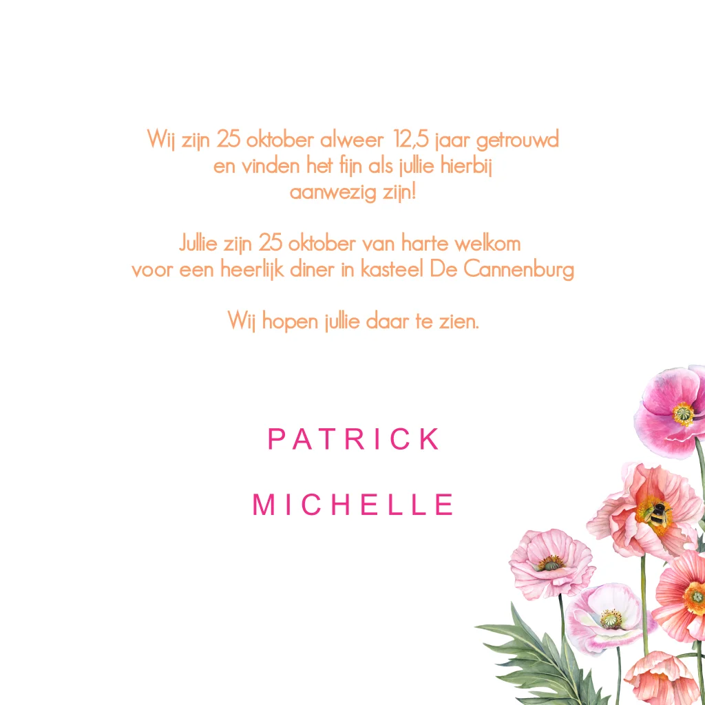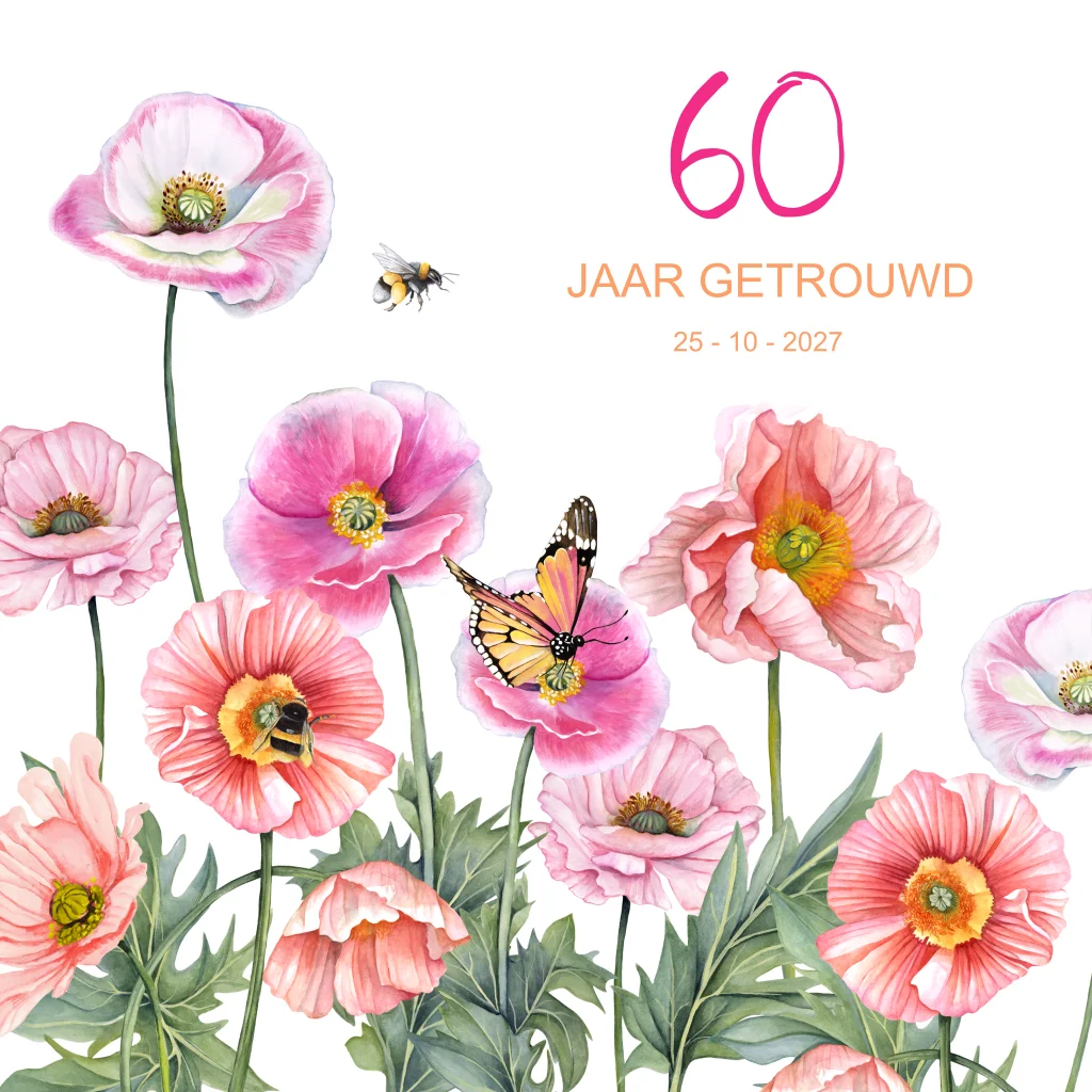 Uitnodiging huwelijksjubileum 60 jaar getrouwd uitnodiging met klaprozen en bijtjes. (23135)