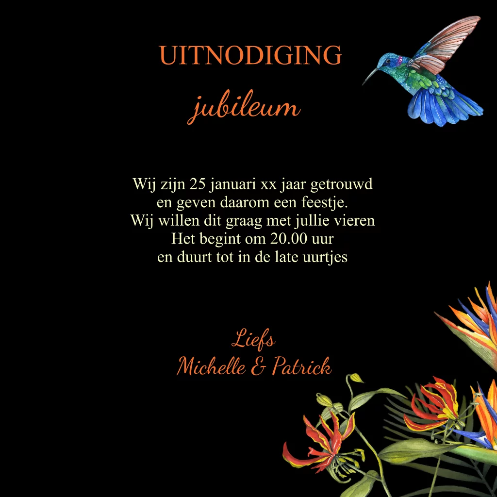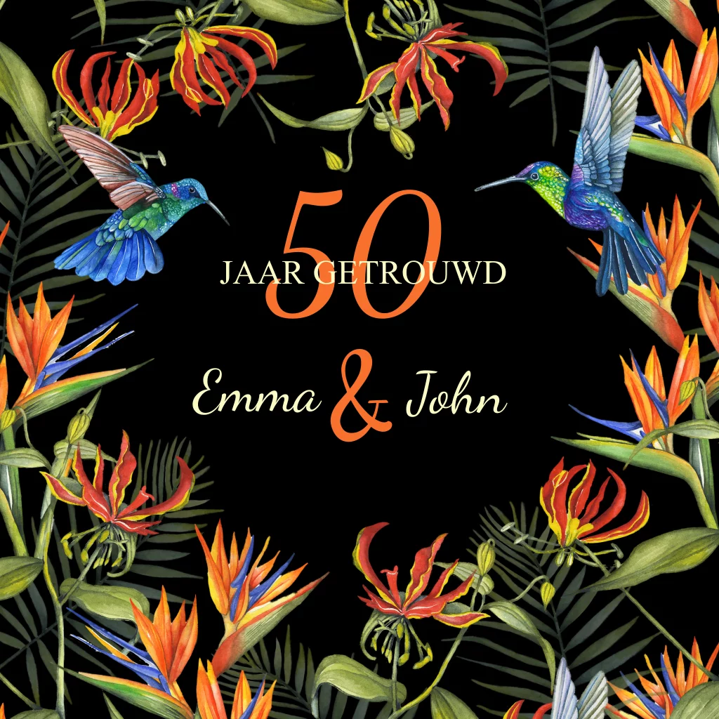 Huwelijksjubileum 50 jaar getrouwd uitnodiging in tropische sfeer met hummingbirds. (21080)