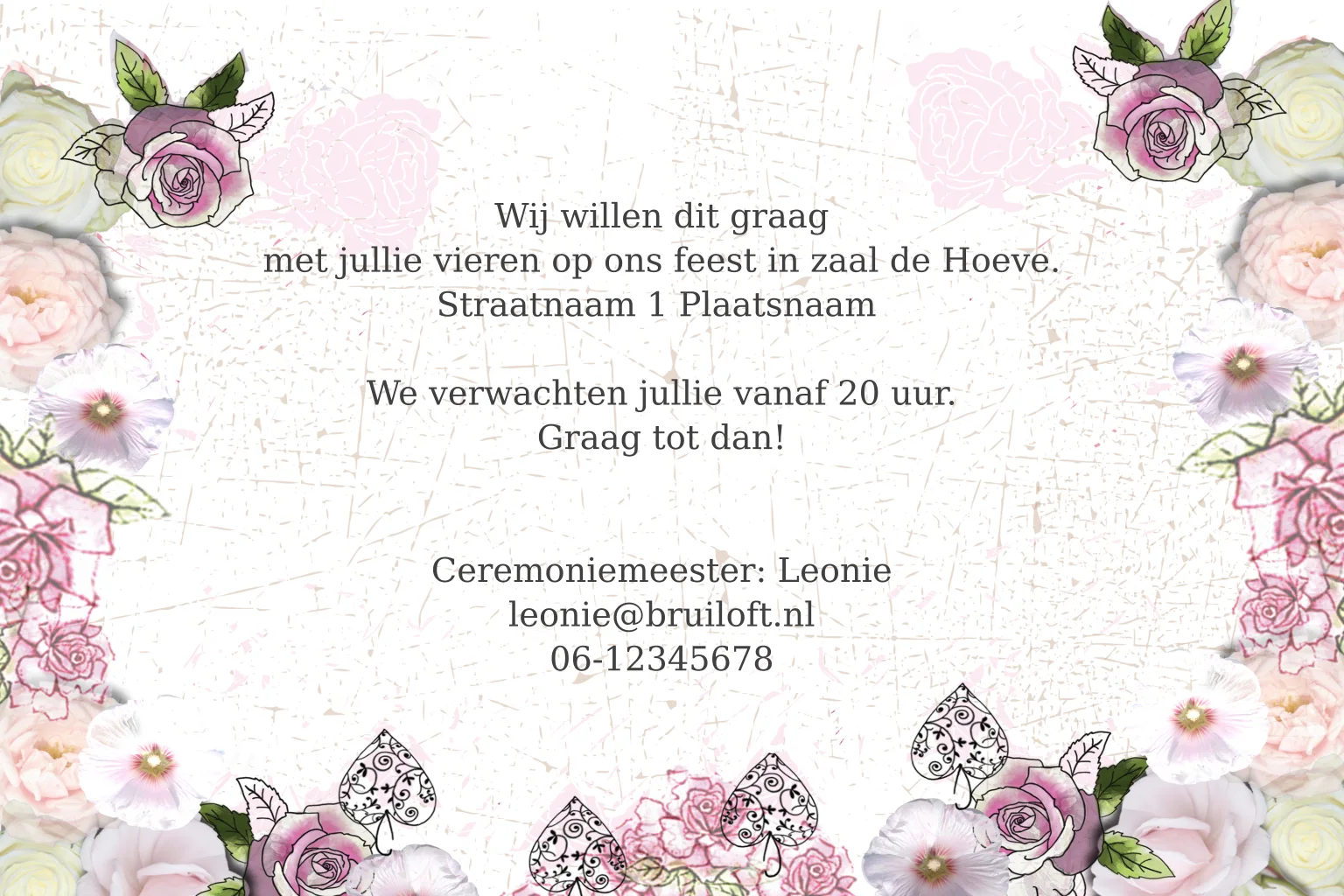 Klassiek getekende trouwkaart met twee houten harten aan lintje. Roze roosjes en vogeltjes. (734)
