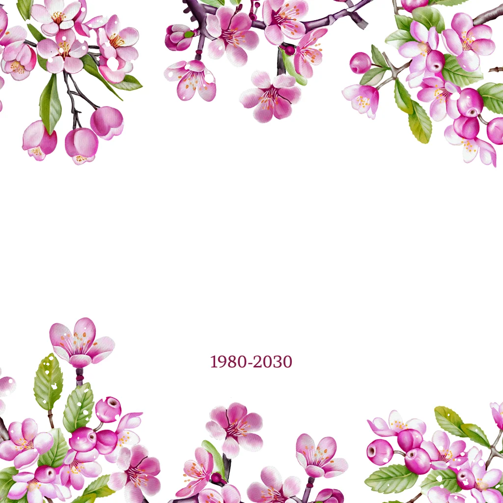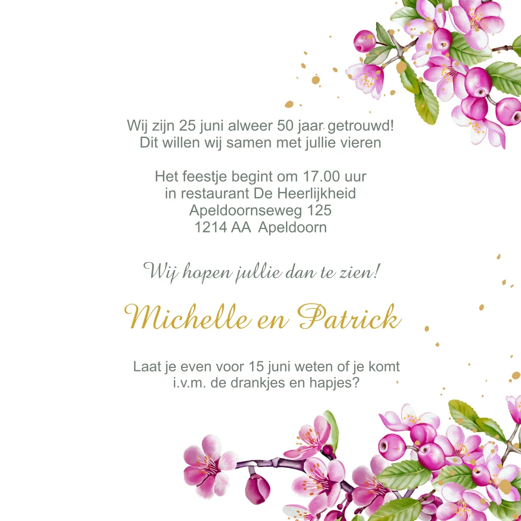 Uitnodiging voor een 50 jarig huwelijksfeest jubileum met roze bloesem takjes en op de voorkant namen in goudfolie. (24459)