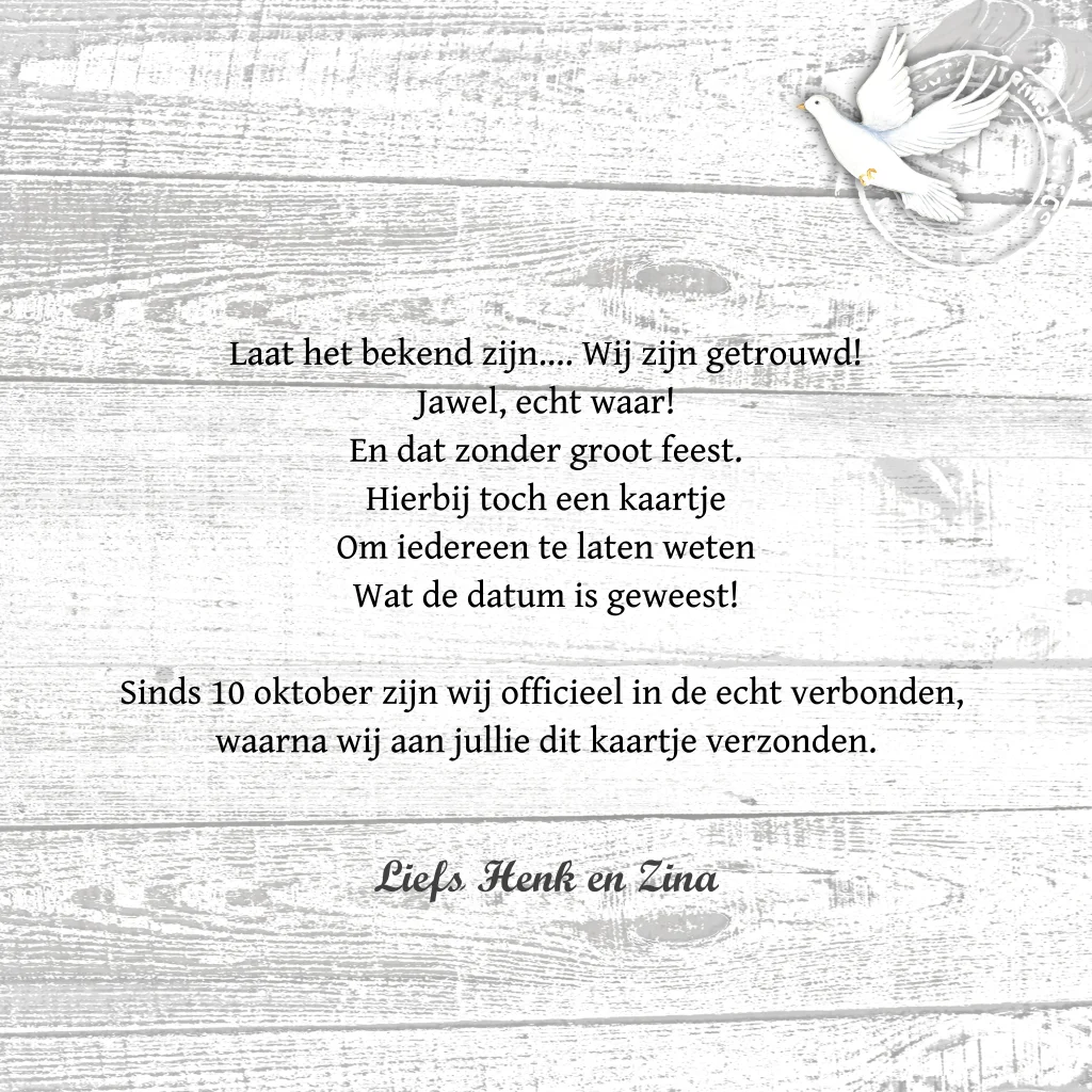 Just married trouwkaart met grijs hout en foto. Witte duiven en oldtimer cabriolet trouwauto. (258)