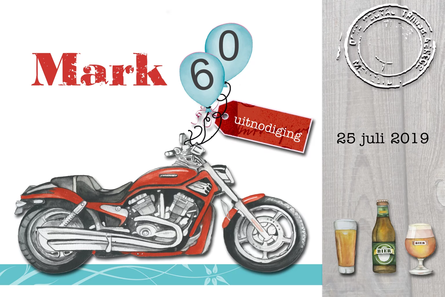 Kaart 60e verjaardag man met rode motor en steigerhout. Bier ernaast. (733)