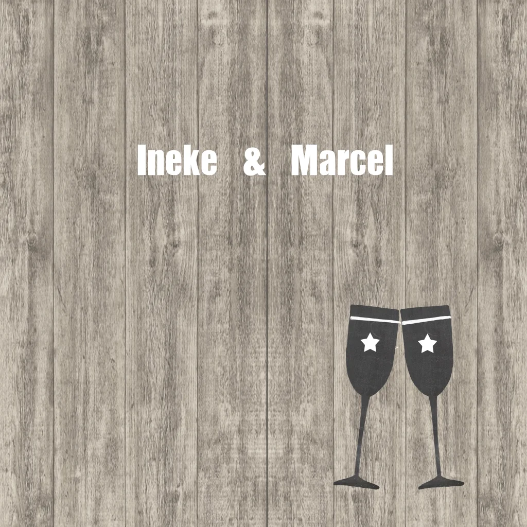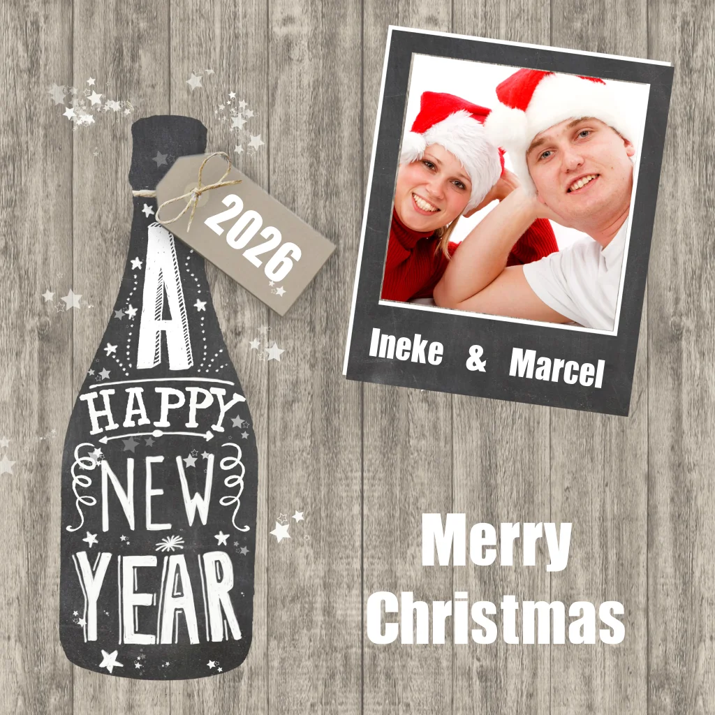 Kerst en nieuwjaarskaart fotokaart met champagnefles als krijtbord op houtprint en leuke foto. (3813)