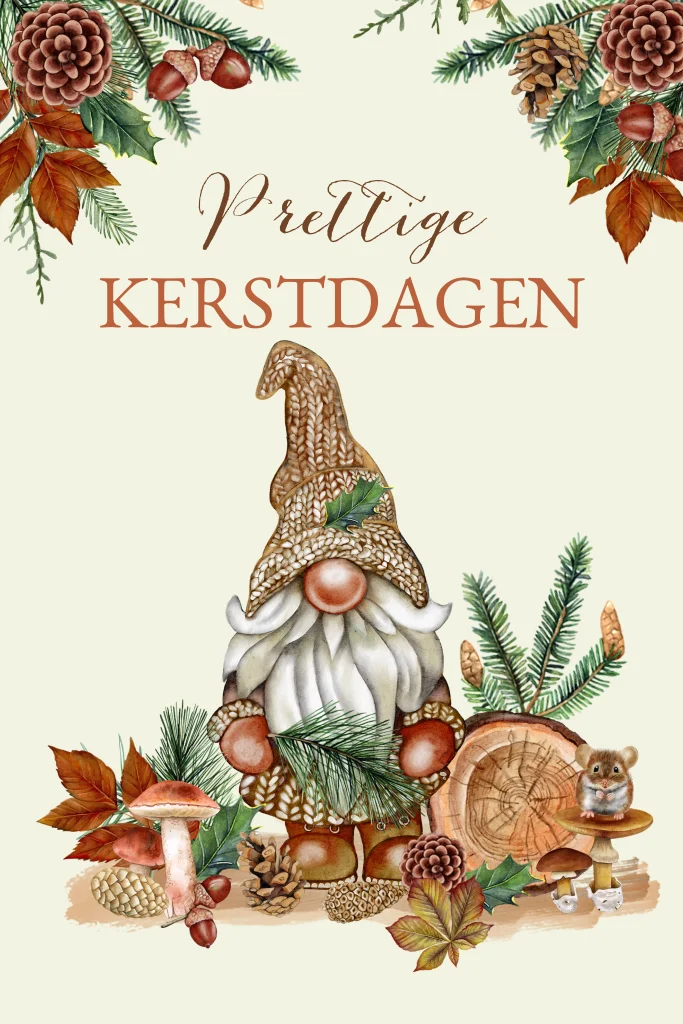 Kerstkaart met getekende gnoom met kabouter in de herfst. (30271)