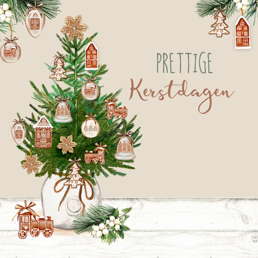 Kerstkaart met kerstboompje in een pot met verschillende gingerbread versieringen. (24315)