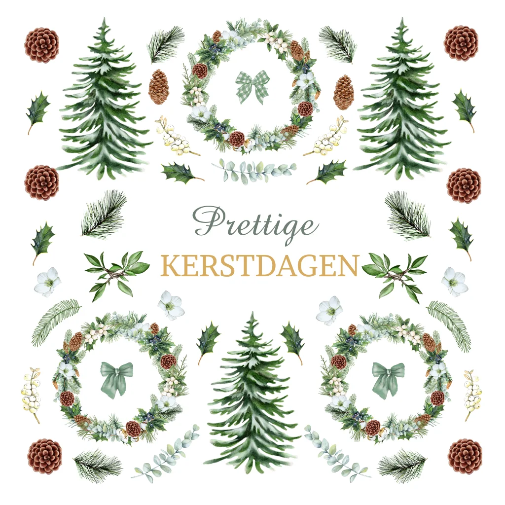 Kerstkaart met patroon van kerstkrans, bomen en takken. (30273)